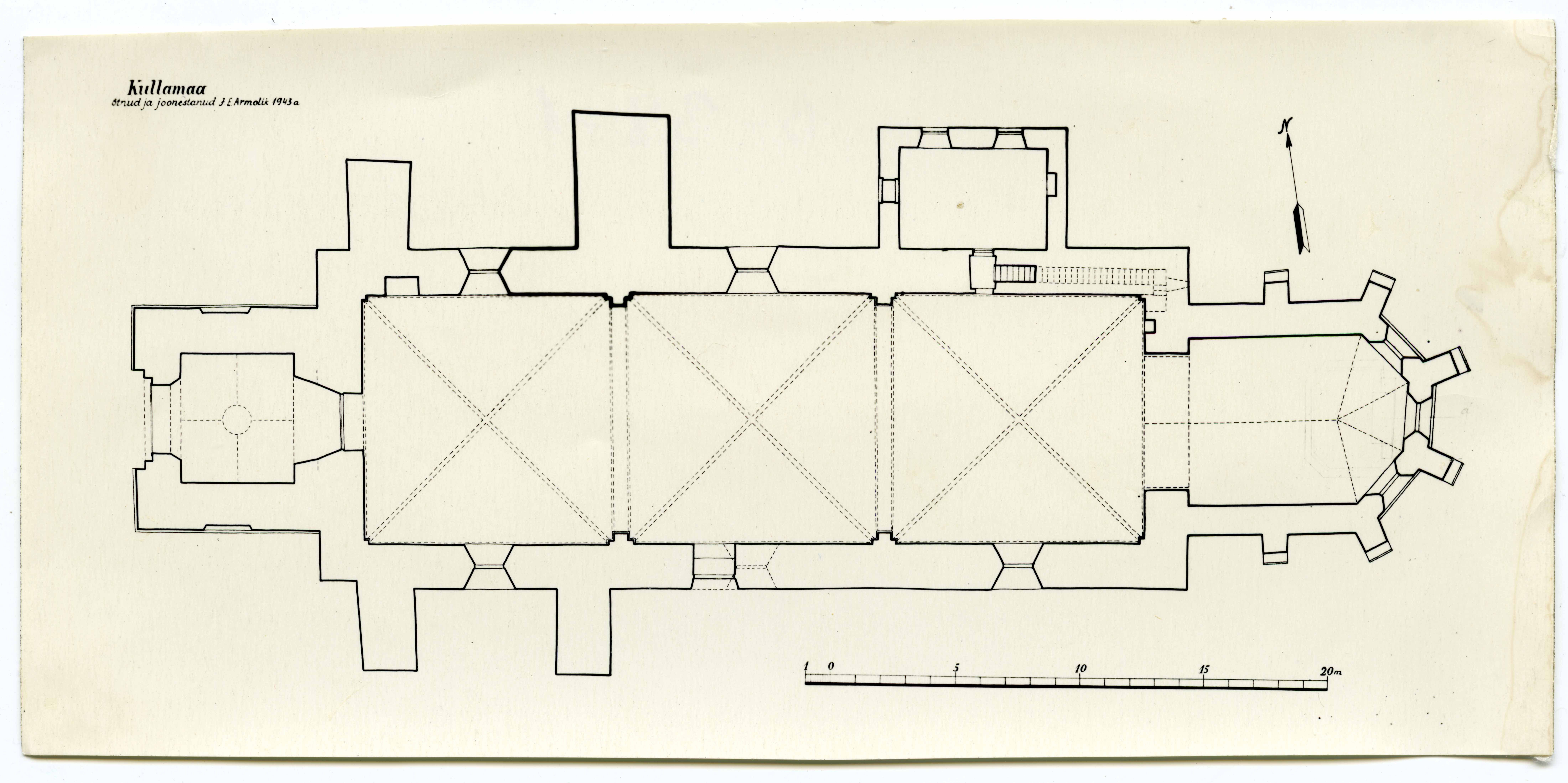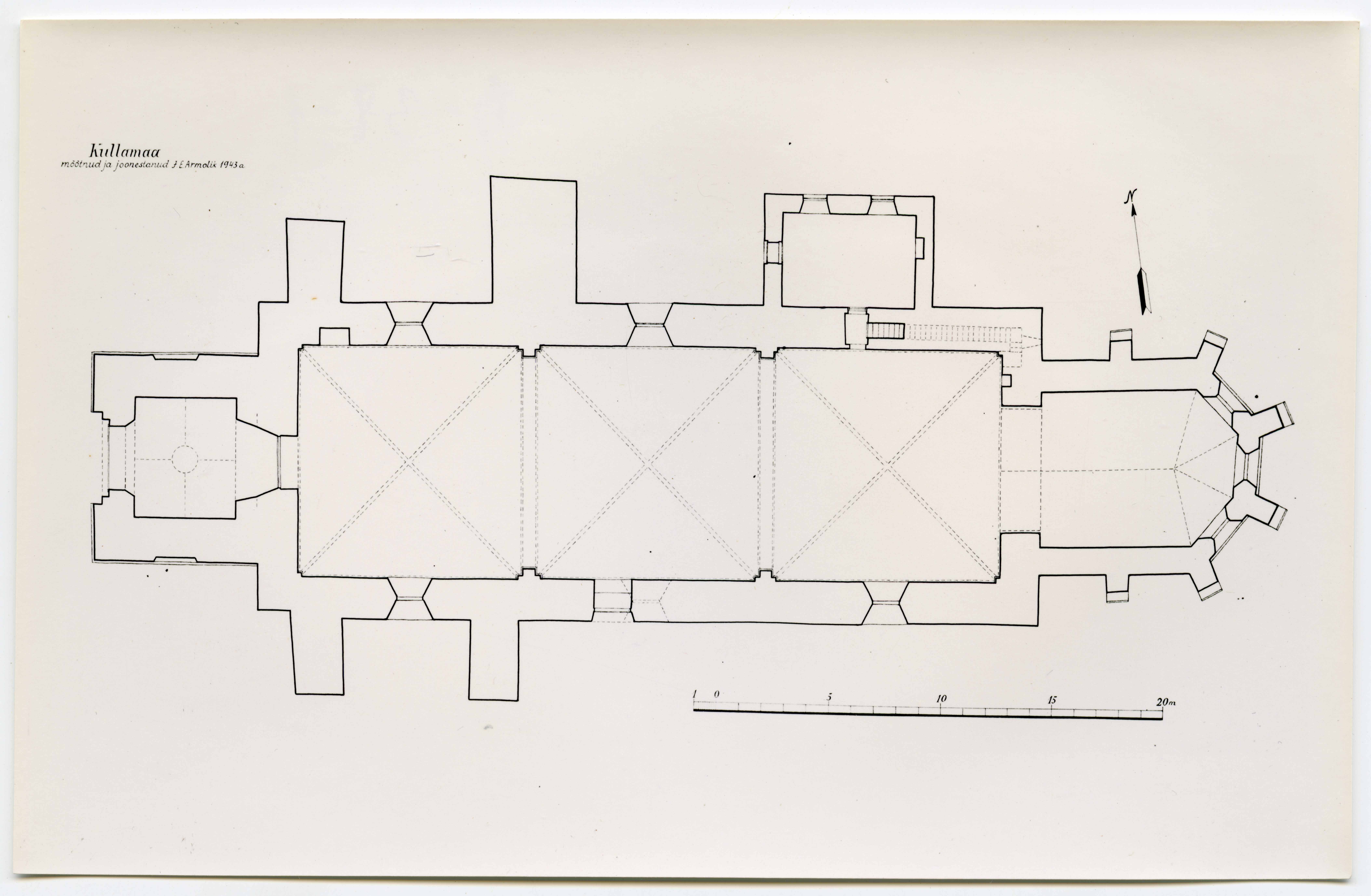 Kullamaa Jaani kirik. Põhiplaan. Mõõtnud ja joonestanud J. Armolik 1943
