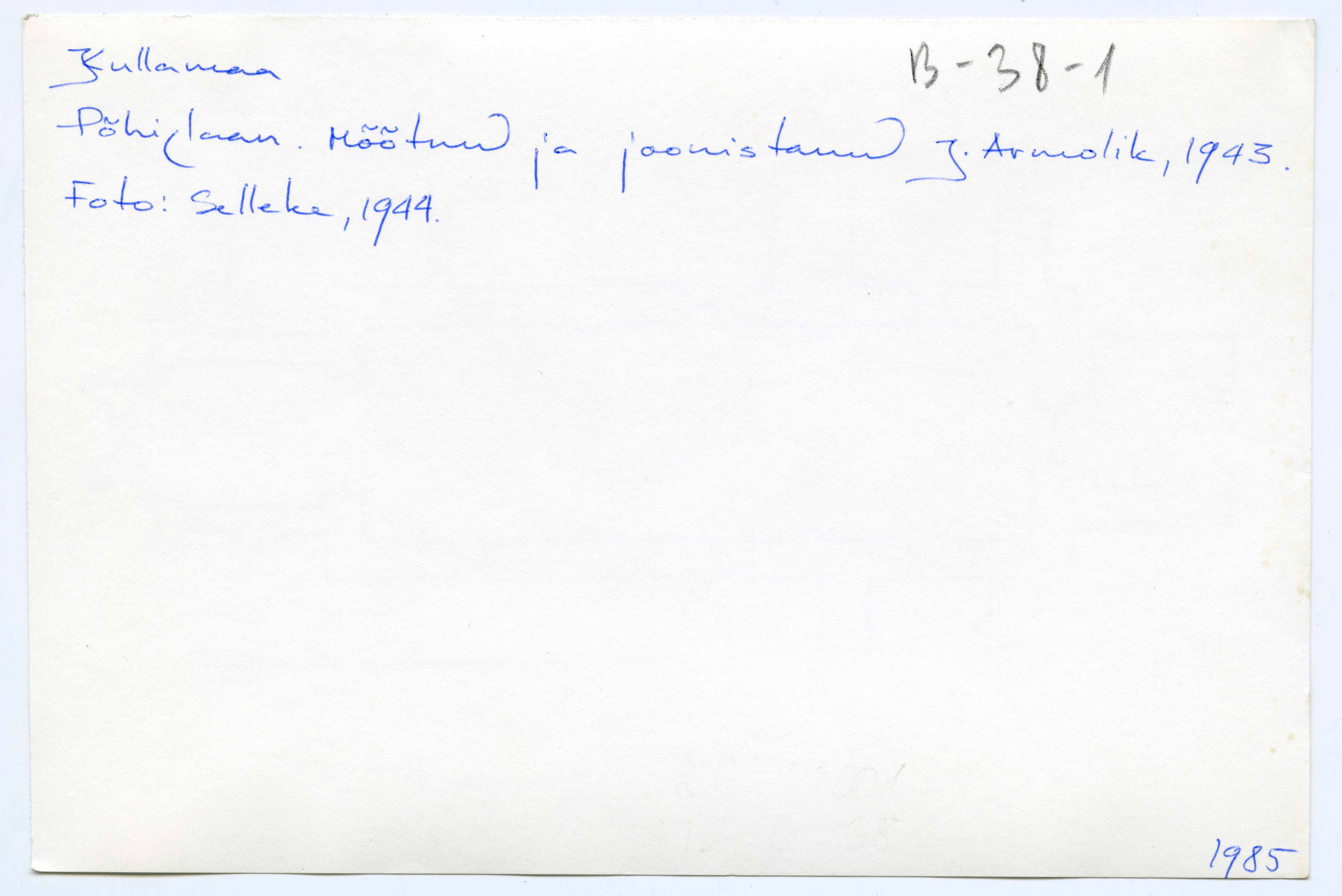Tekst negatiivi ümbrikul: Kullamaa. Põhiplaan. Mõõtnud ja joonestanud J. Armolik 1943.a. Foto Selleke 1944.a. Tempel: Instituut