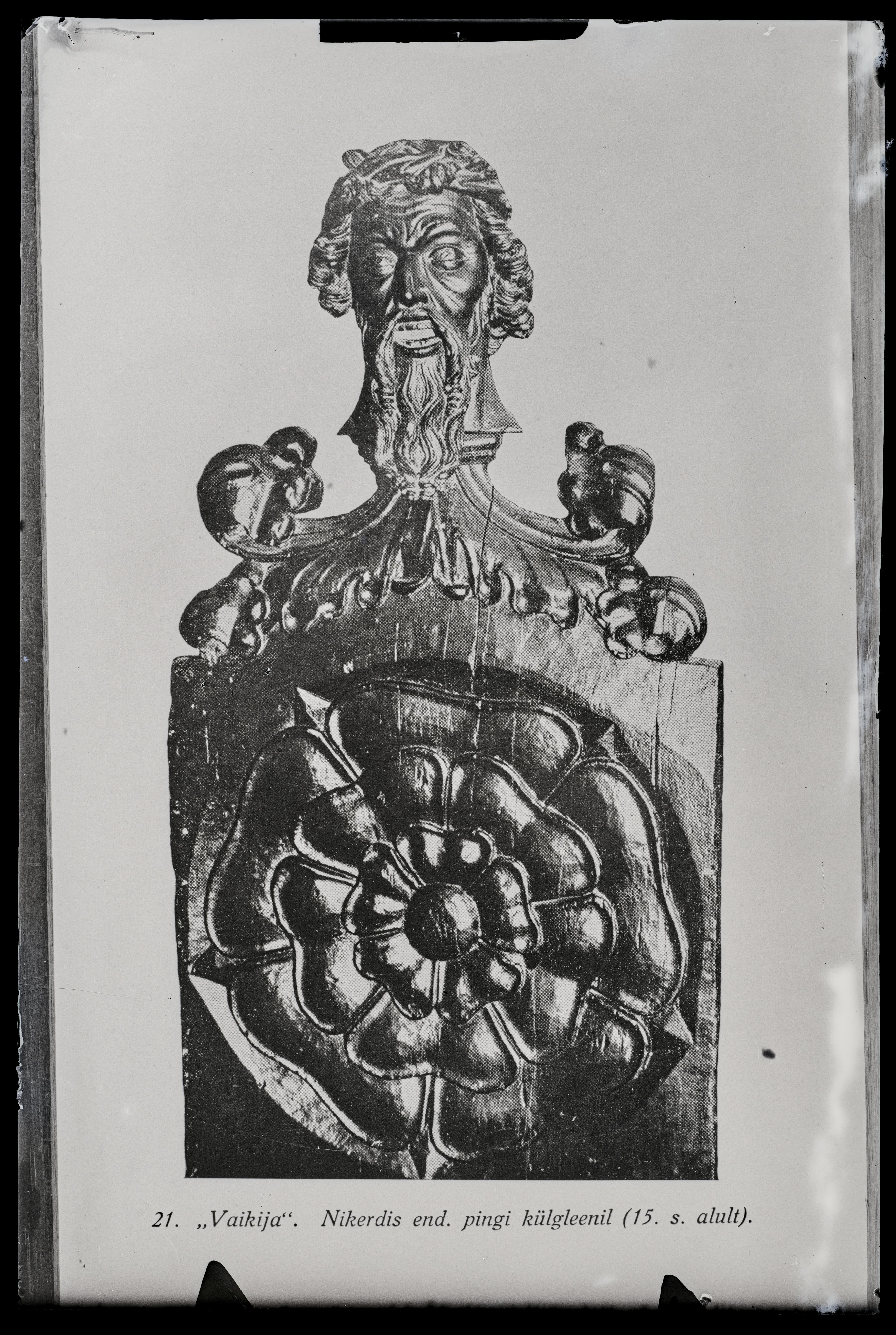 Tallinn. All-linn. Raekoda. Raesaal. Puunikerdus "Vaikija" raepingi otsalt. Repro trükisest