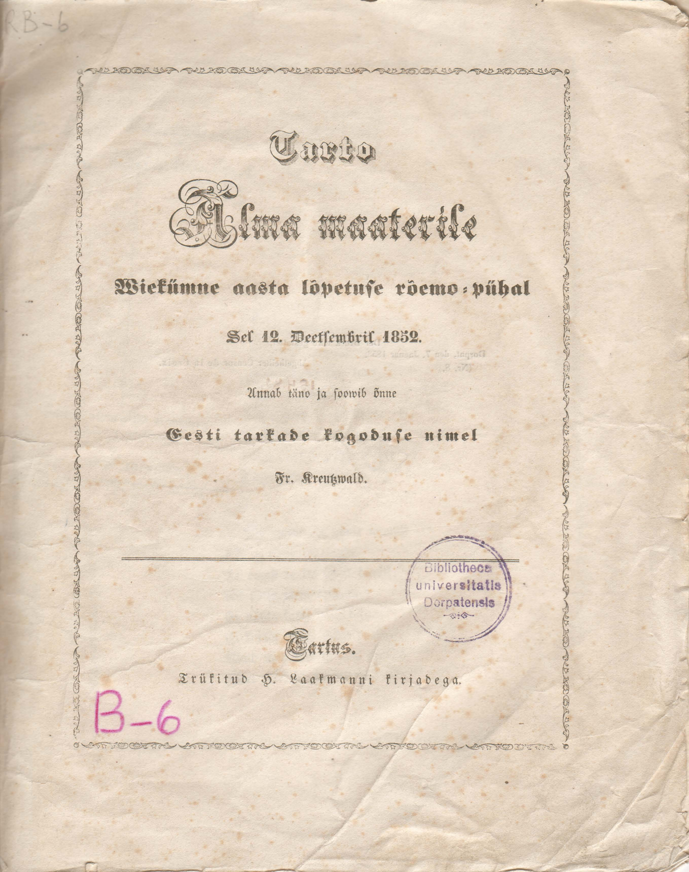 Gratulations-Gedicht zur funfzigjährigen Jubelfeier der Kaiserlichen Universität Dorpat am 12. December 1852