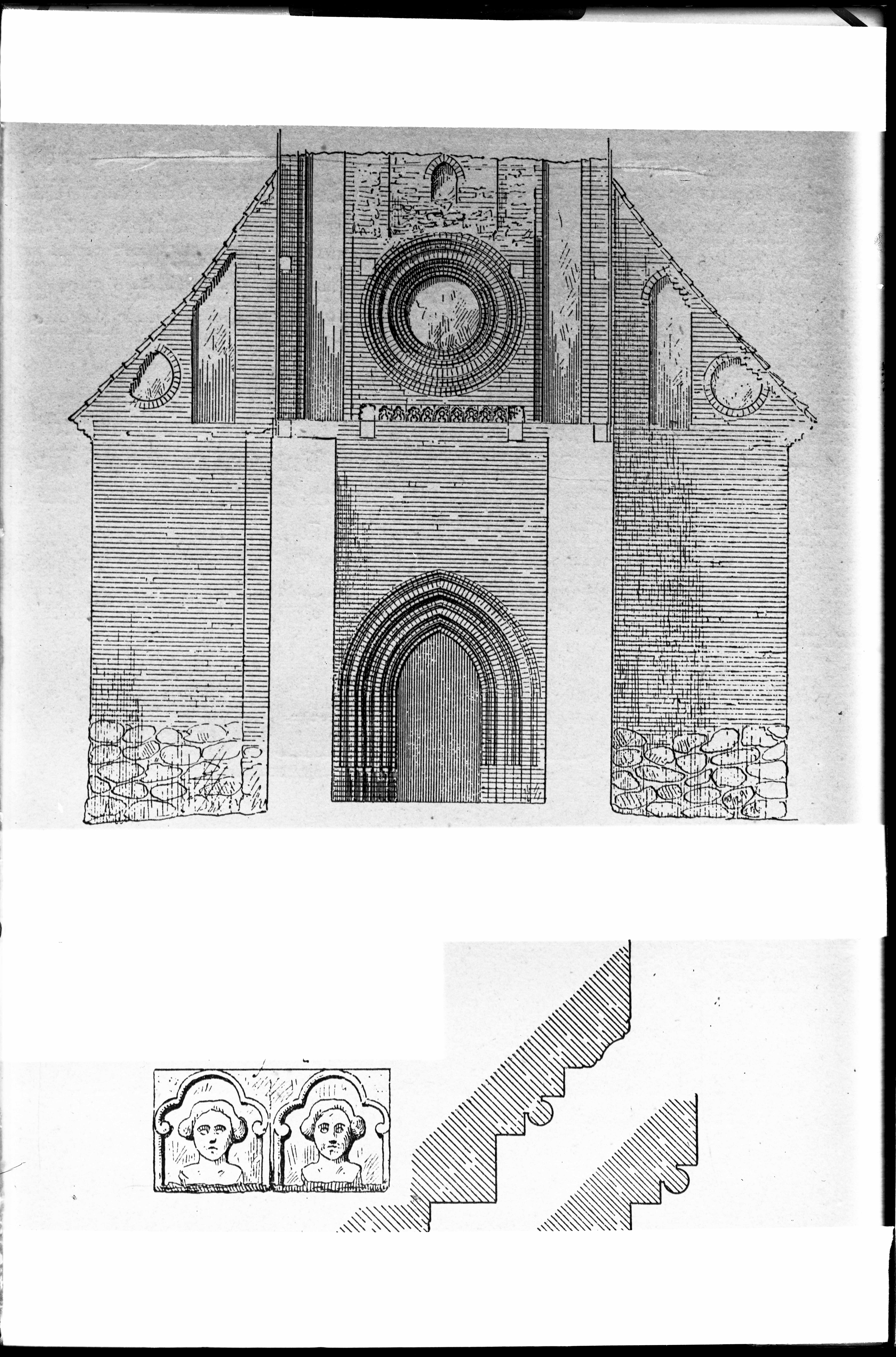 Deutsch-Tierau (Saksamaa) kiriku W-fassaadi ja selle paiknevate terrakotafiguuride joonised (repro trükisest), vrd Tartu Jaani kirik