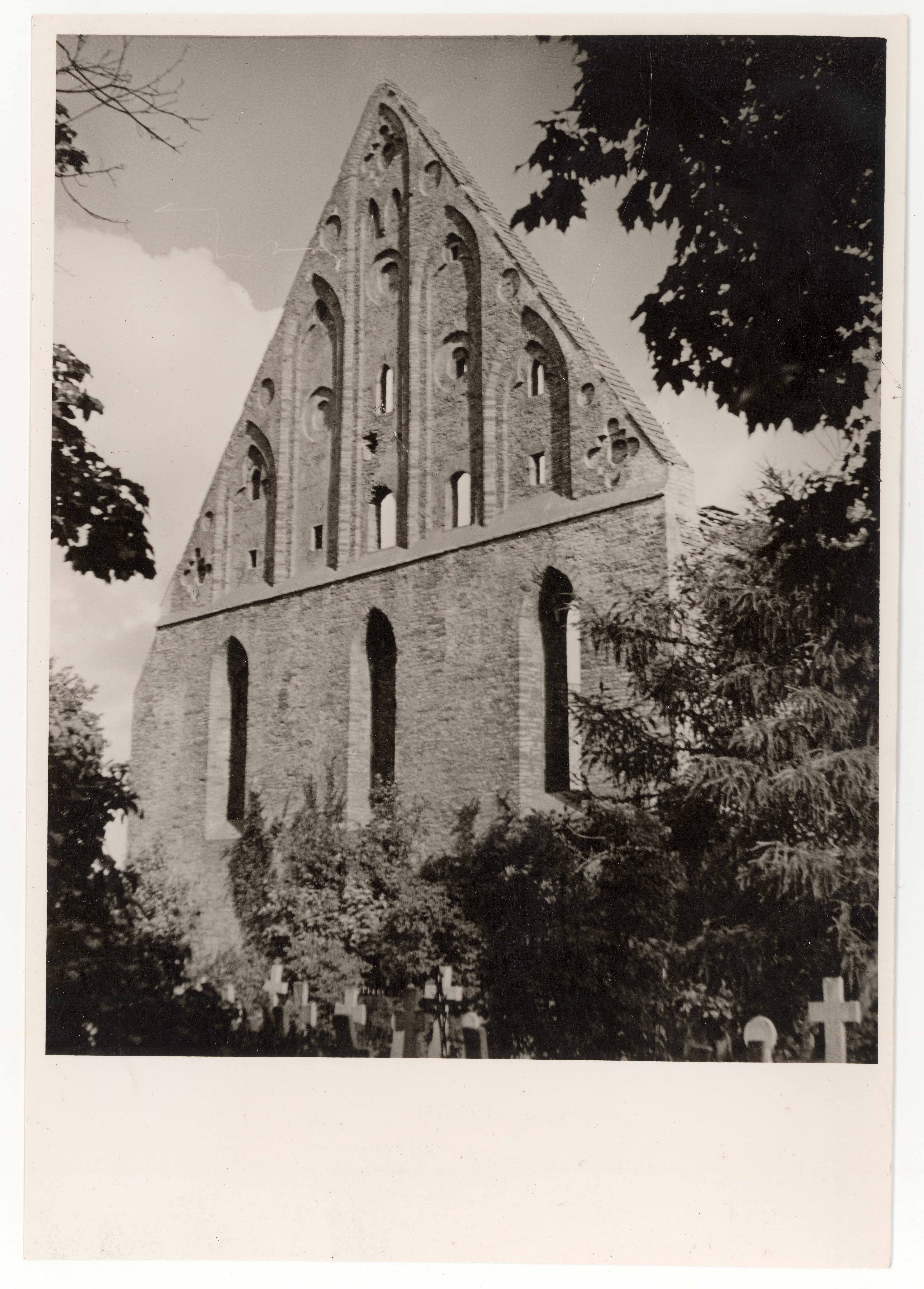 Pirita kloostrikiriku viiluga läänefassaad ja kalmistu SW-st. Lääneviil konserveeritud