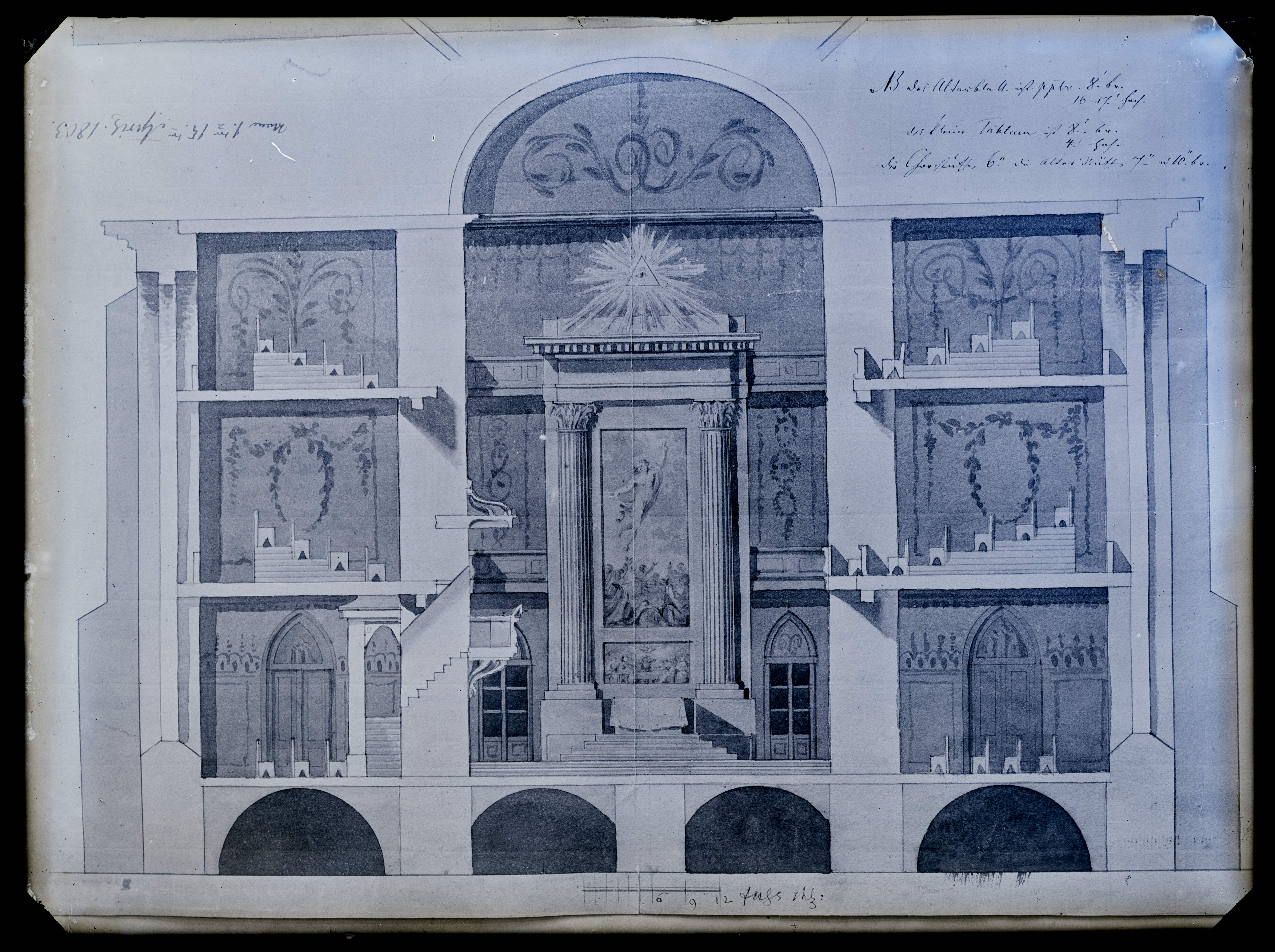 Tekst negatiivi ümbrikul: Krause. Toomkiriku varemetes kavatsetud kiriku põikilõige. Foto Lomp, 1924. Tempel: Instituut