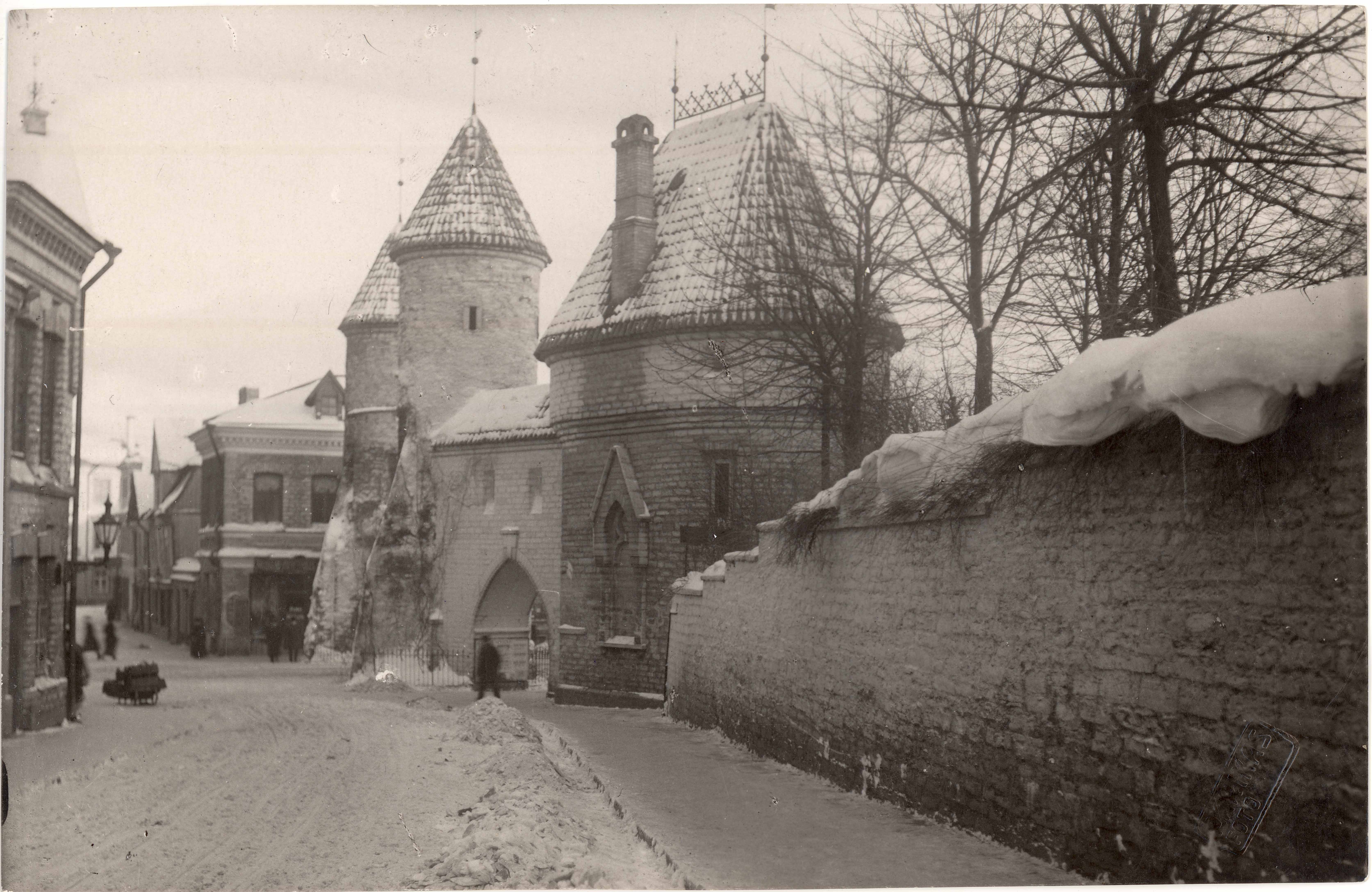 Tallinn. All-linn. Vaade S-st Valli tänavast Viru värava eesvärava tornidele 20. sajandi alguses. Foto tehtud talvel