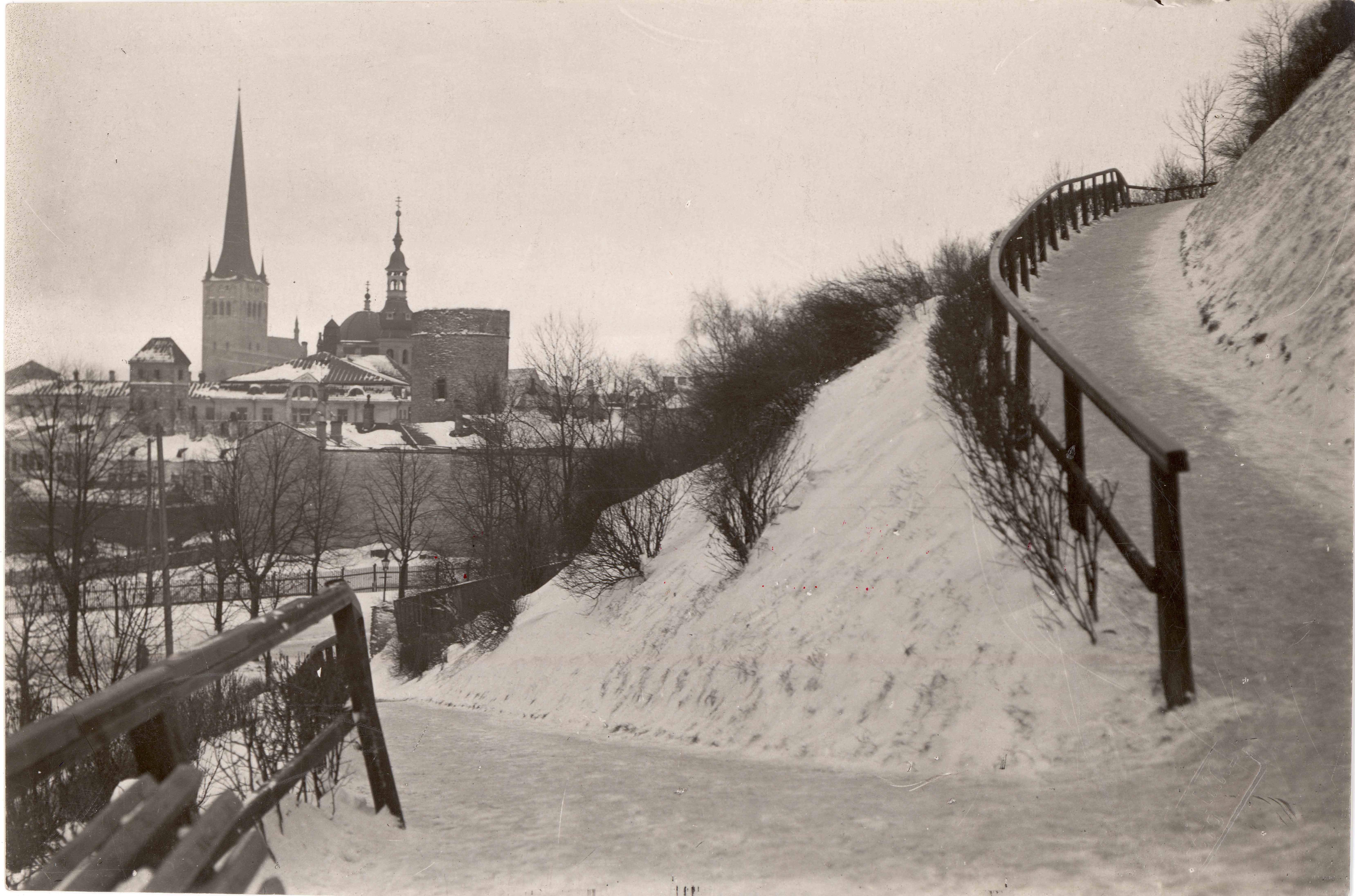 Tallinn. All-linn. Vaade Patkuli trepilt kagu suunas Oleviste kiriku poole talvel