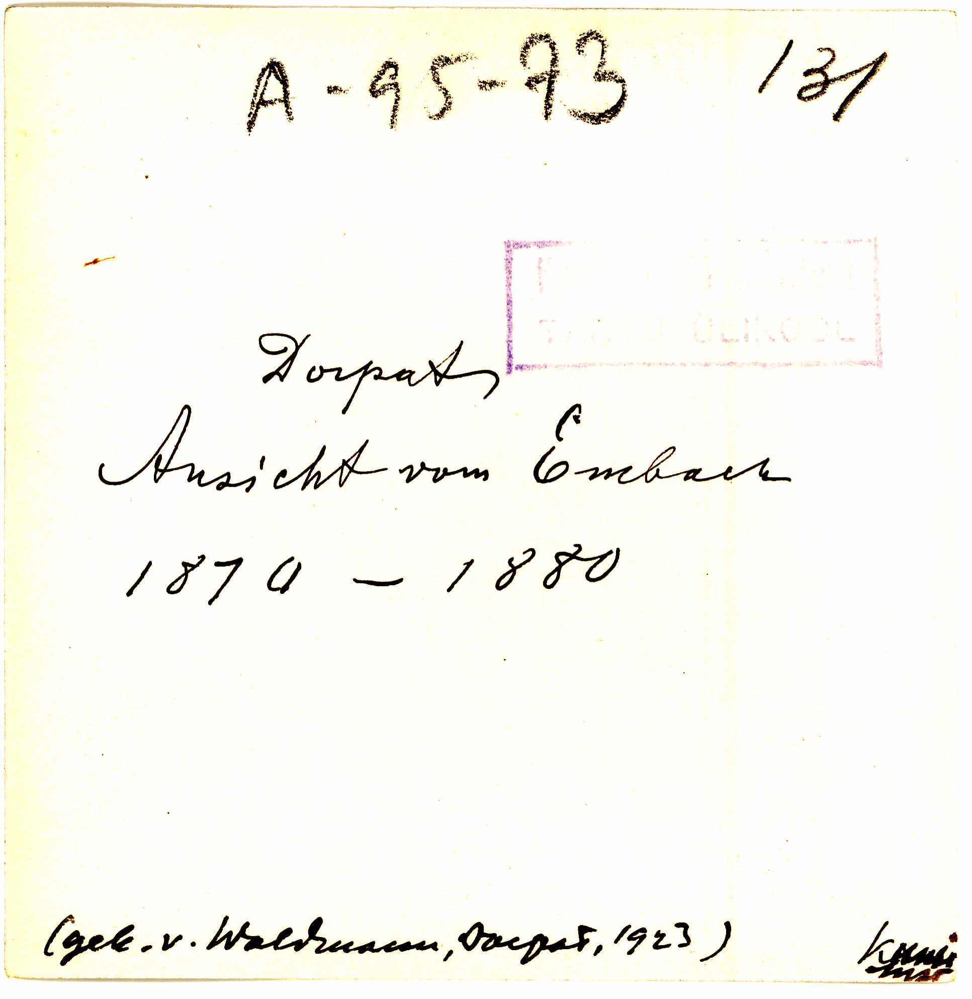 Tekst foto tagaküljel: Dorpat. Ansicht vom Embach. 1870-1880. (gek v Waldmann, Dorpat, 1923) Kunst. Inst. Tempel: Instituut