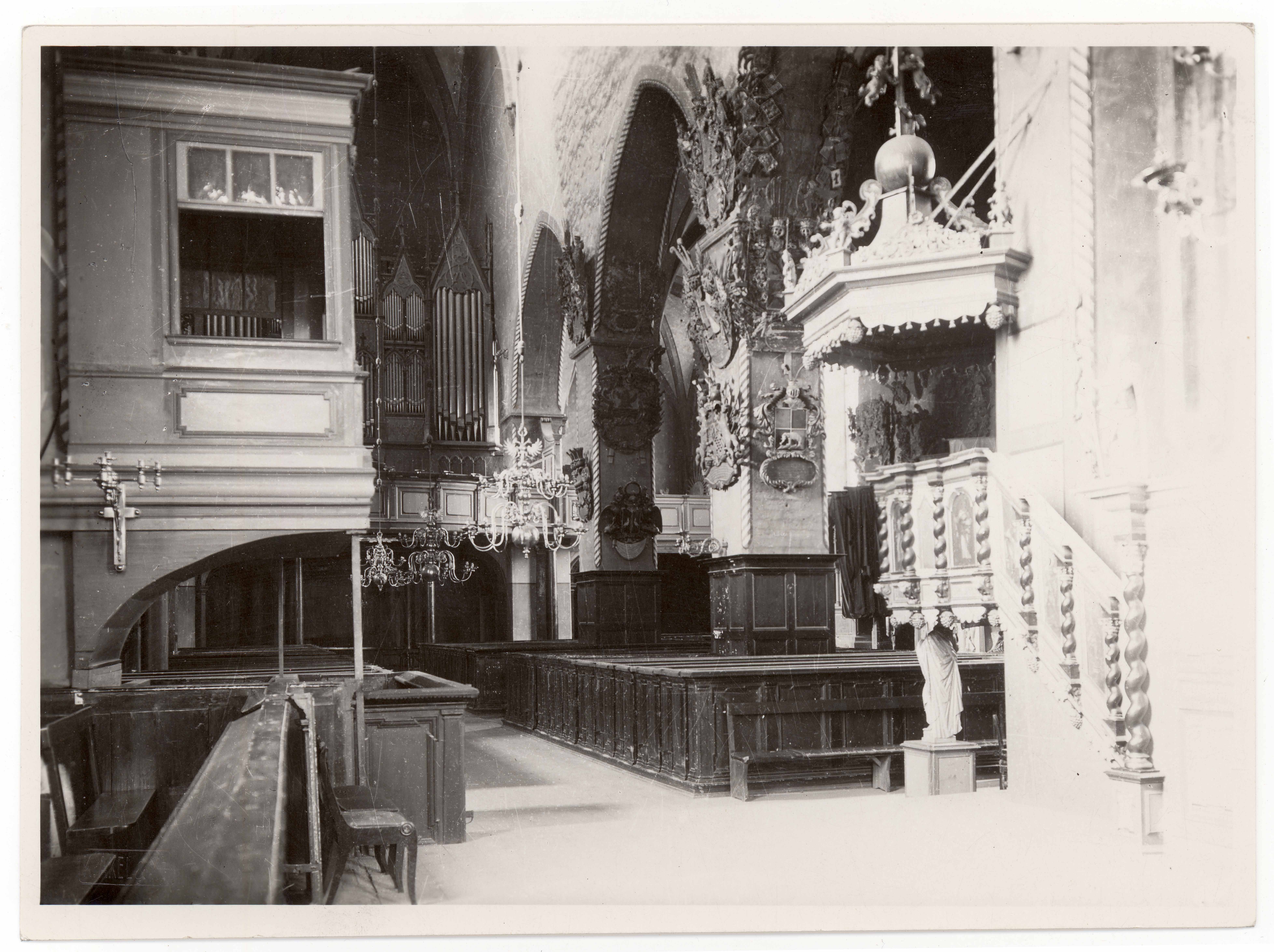 Tallinn. Toomkirik. Sisevaade kooriruumist loode suunas orelirõdu poole. Vasakul Manteuffelite loož, paremal kantsel