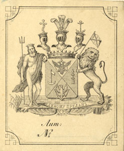 Nelinurkses ornamenteeritud raamistuses vapp, vasakul kolmhargiga Neptun, paremal lippu hoidev lõvi, vapikilbi kohal kroon ja kolm kiivrit, nelitatud vapikilbil ühe- ja kahepäine kotkas, nool ja lipp. Joonises all lindil deviis: ЕДИНОМУ ПРЕДАНЪ. all: Лит:_ / №_