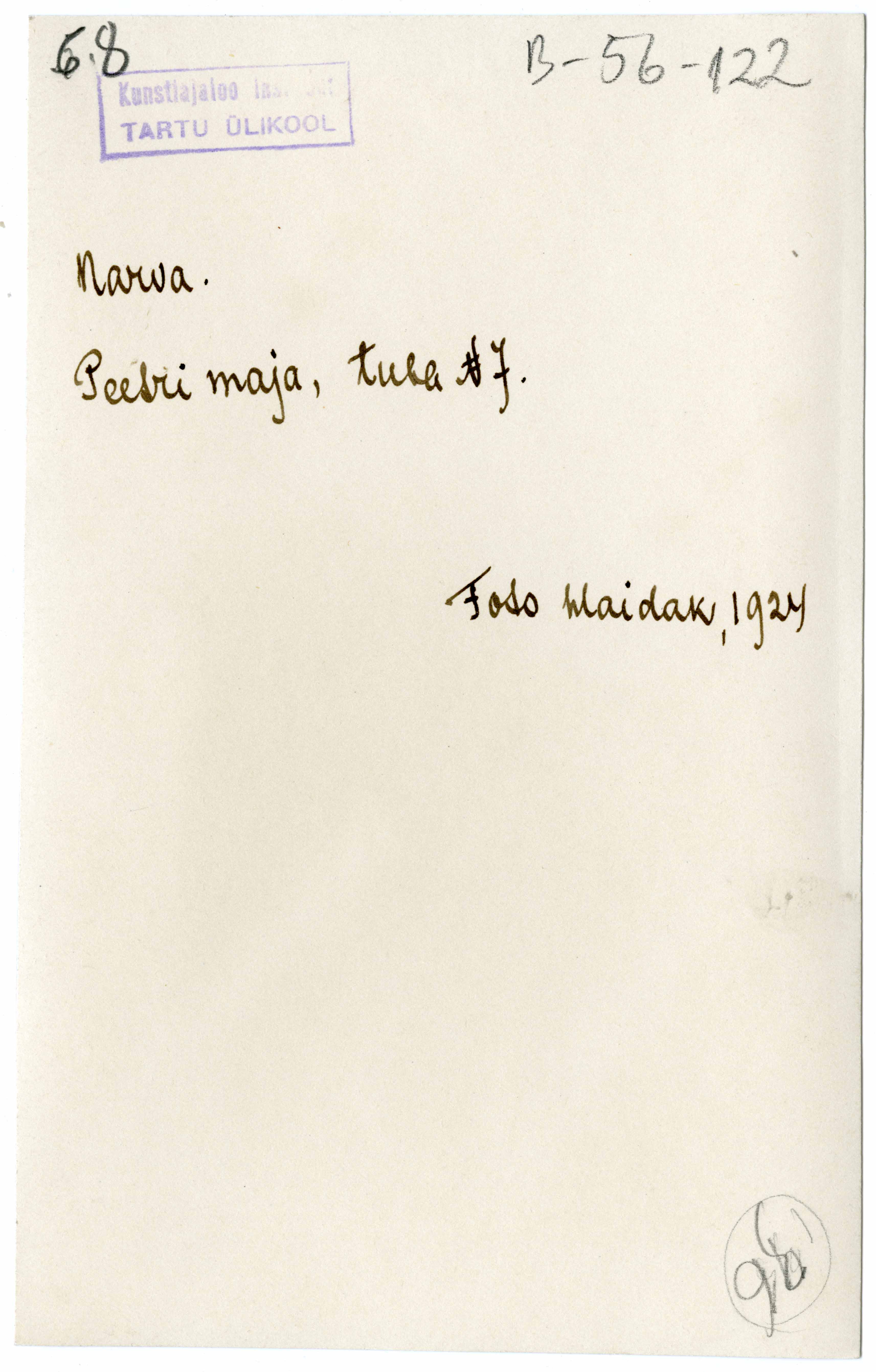 Tekst foto tagaküljel: Narva. Peetri maja, tuba N7. Foto Haidak 1924. Tempel: Instituut