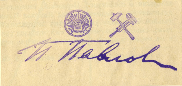 Ringikujuline ja ristatud tööriistu kujutavad embleemid ja allkiri: И. Павлов
