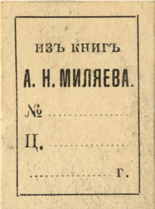 Nelinurkses raamistuses: ИЗЪ КНИГЪ / А.Н. МИЛЯЕВА. / № ... / Ц. ... / ... г