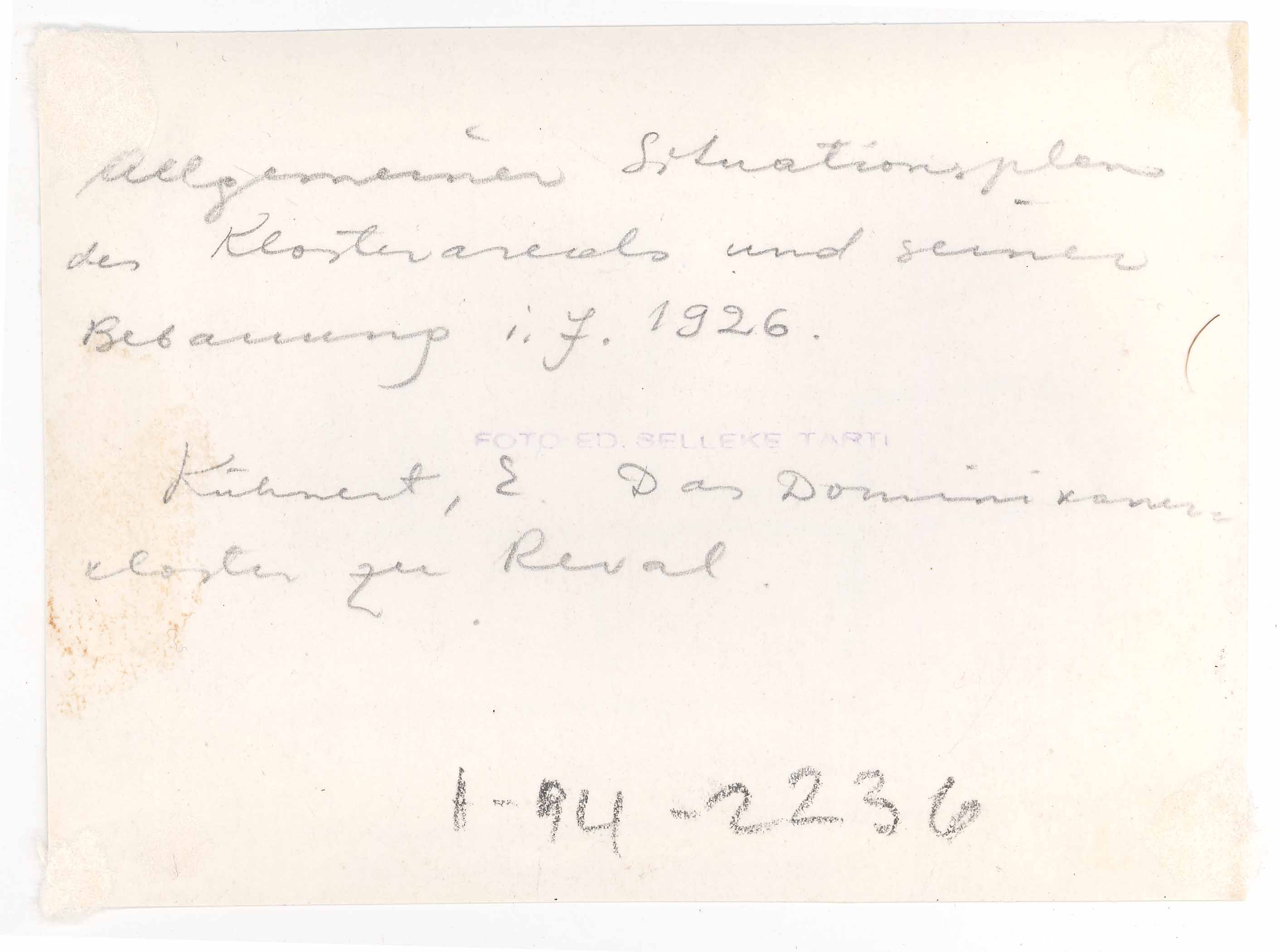 Tekst foto tagaküljel: Allgemeiner Situationsplan des Klosterareals und seiner Bebauung i. J. 1926. Kühnert, E. Das Dominikaner kloster zu Reval. Tempel: ED. SELLEKE