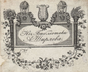Keskel nelinurkne tahvel, selle kohal lüüra kahe gloobuse vahel, ümberringi lillevanik. Joonises keskel tahvlil: Изъ Библiотеки / А. Ширяева. all vasakul: N°