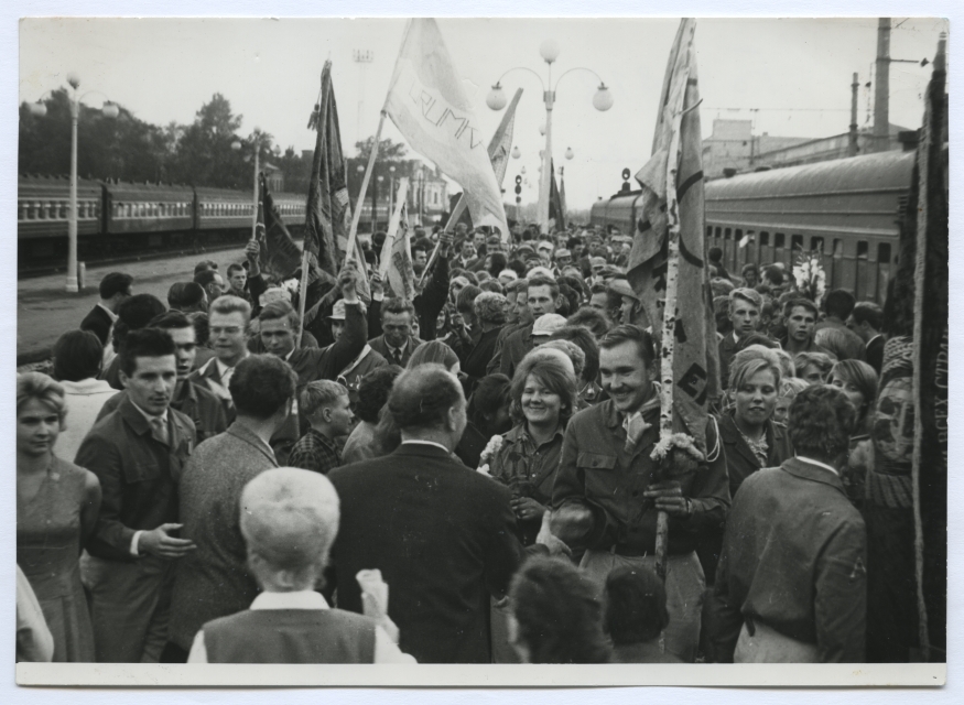 Tartu ülikooli üliõpilastest uudismaalaste vastuvõtt Tallinnas Balti jaamas augustis 1965