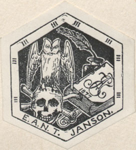 Kuusnurkses raamistuses mustal taustal öökull kolbal, raamat ja tindipott hanesulega. Joonises all: E.N.A.T. JANSON. keskel paremal raamatu kaanel tähtedest E, N, A ja T moodustatud monogramm ja 1877