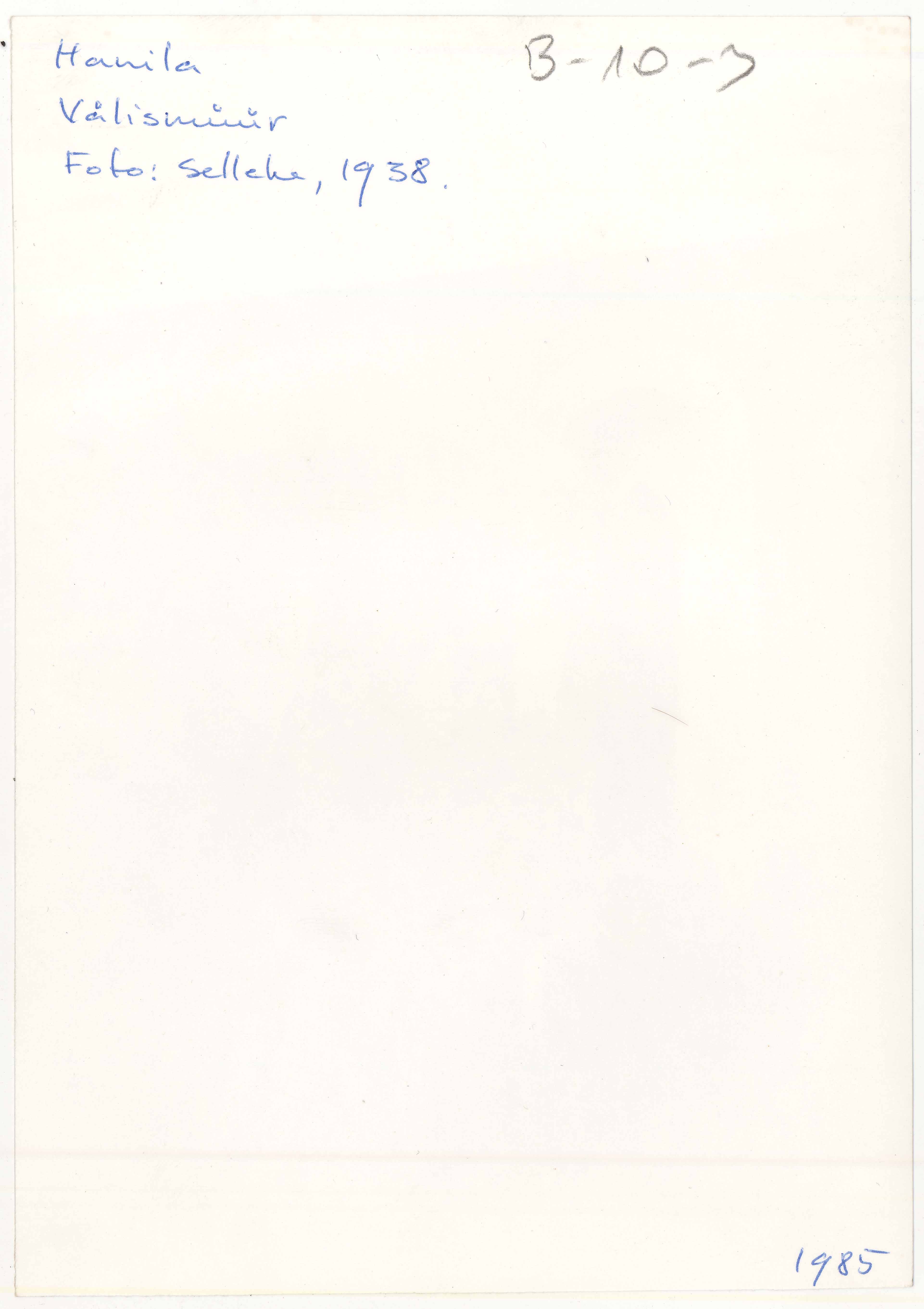 Tekst negatiivi ümbrikul: Hanila, välismüür. (1985) Templid: Hamini dep, Selleke 1938