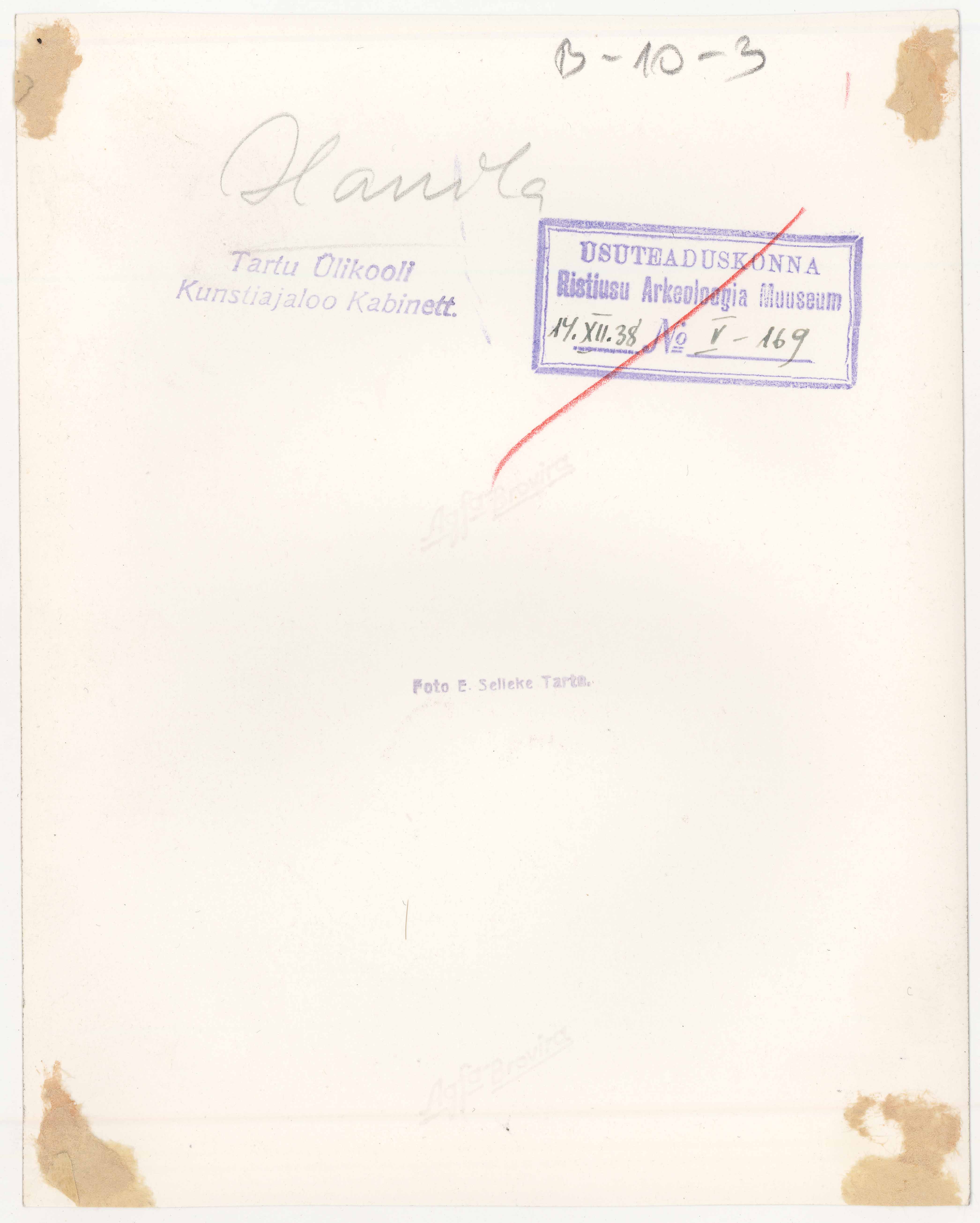 Tekst foto tagaküljel: Hanila. Templid: E. Selleke; Kabinett; RAM 14.XII.38 No V-164
