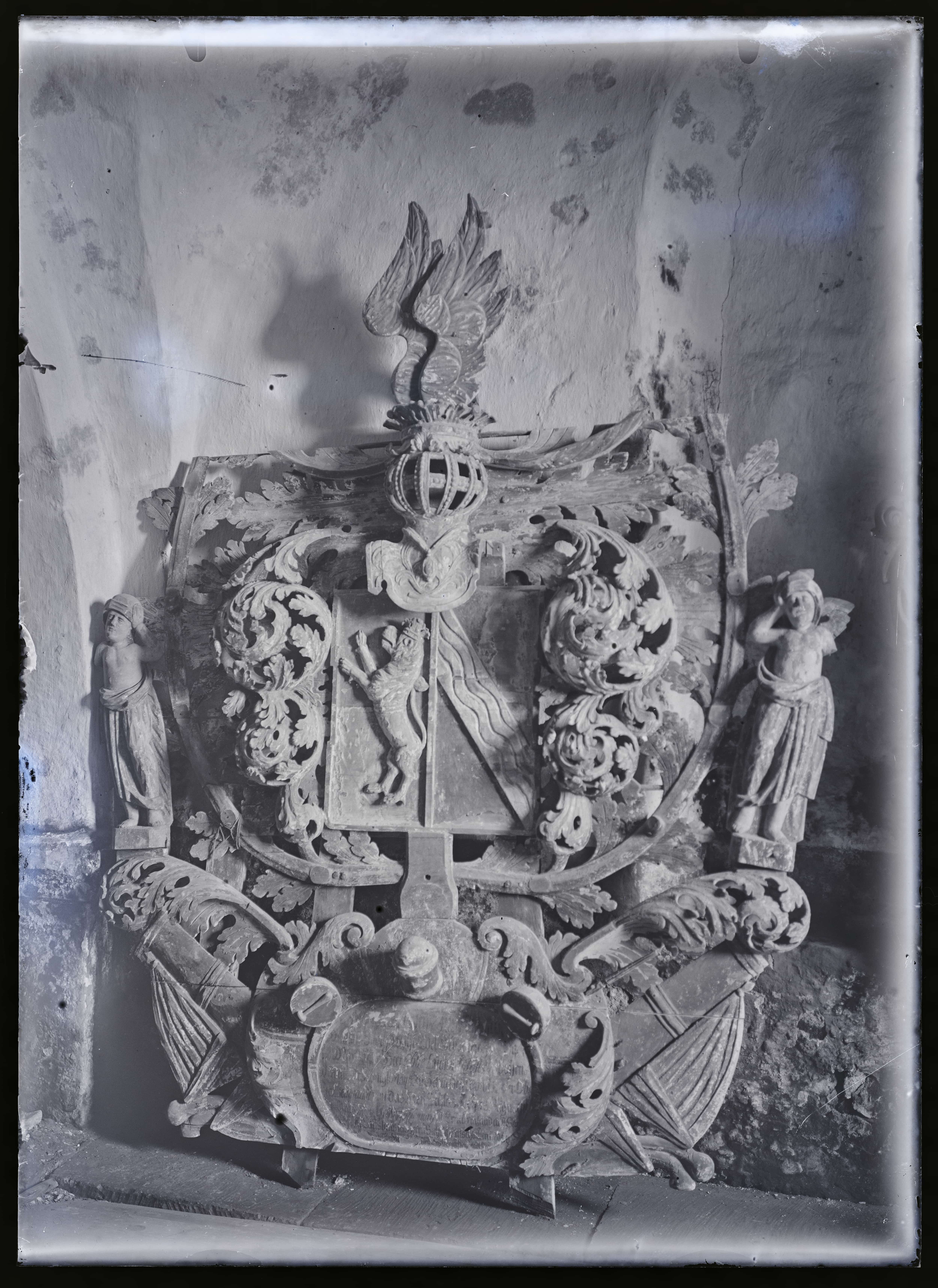 Kaarma Peetri ja Pauli kirik. Sisevaade. Põhjaportaal. Carl Johann Ekesparre hauakambri sümboolne uks nikerdatud ehisraamis. Christian Ackermann. Detail. Ukse tümpanoni kaunistus