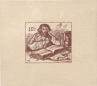 Nelinurkses raamis lugev mees, parem käsi hlma all, vasakuga toetab pead. Joonises all paremal signeering ülal vasakul monogramm: ИAP;"Иваск