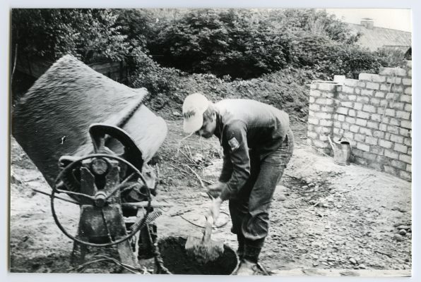 Eesti Üliõpilaste Ehitusmaleva Muhu rühma liige segumasina juures 1981. a.