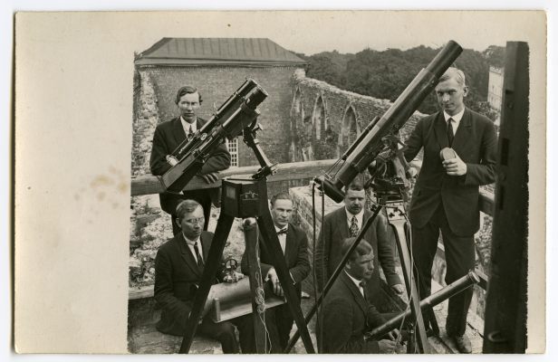 Tartu ülikooli füüsika instituudi töötajad vaatlemas päikesevarjutust Tartu Toomkiriku varemetel. Grupipilt