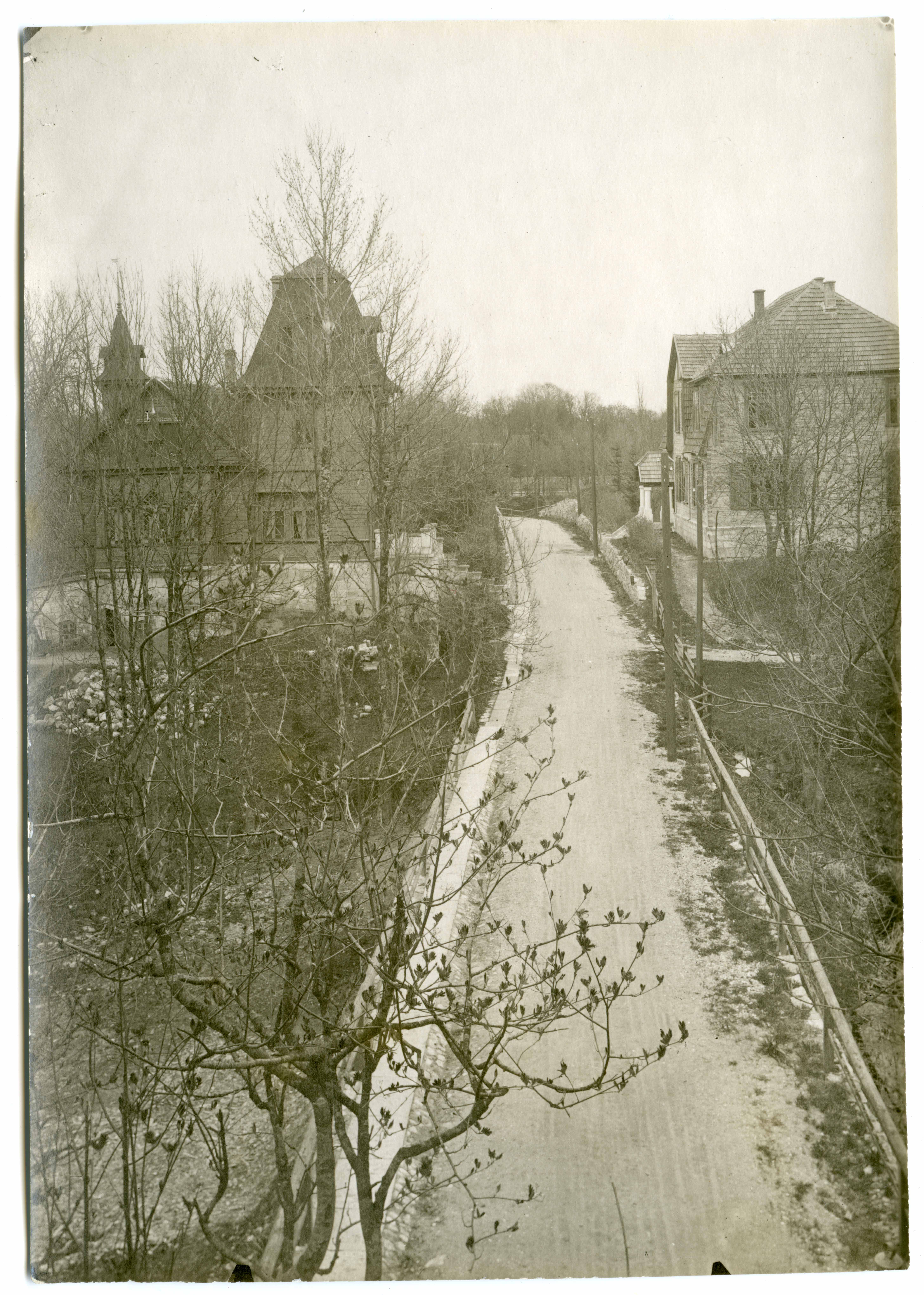 Kuressaare linnus. Vaade bastionimüürilt linnusesse viiva tee ääres paiknevatele historitsistlikele majadele Lossi tn 11 ja 16 NO suunas