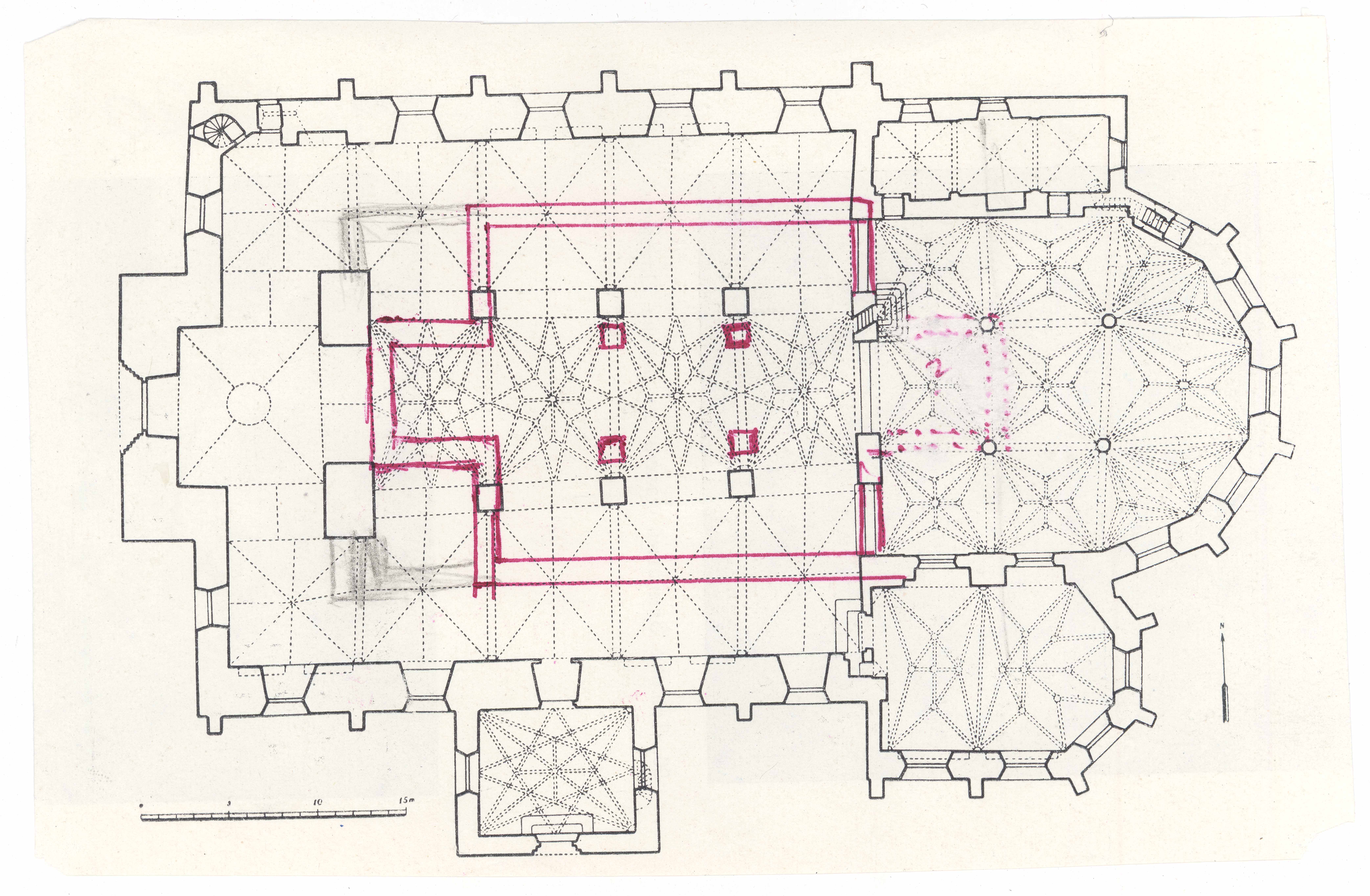 Tallinn. All-linn. Oleviste kiriku põhiplaan. Koostanud O. Grohmann 1939. Punase pastakaga peale märgitud varasem ehitusjärk