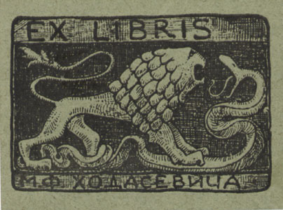 Nelinurkses raamis lõvi ja madu. Joonises all: М. Ф. ХОДАСЕВИЧА. ülal: EX LIBRIS;"Иваск