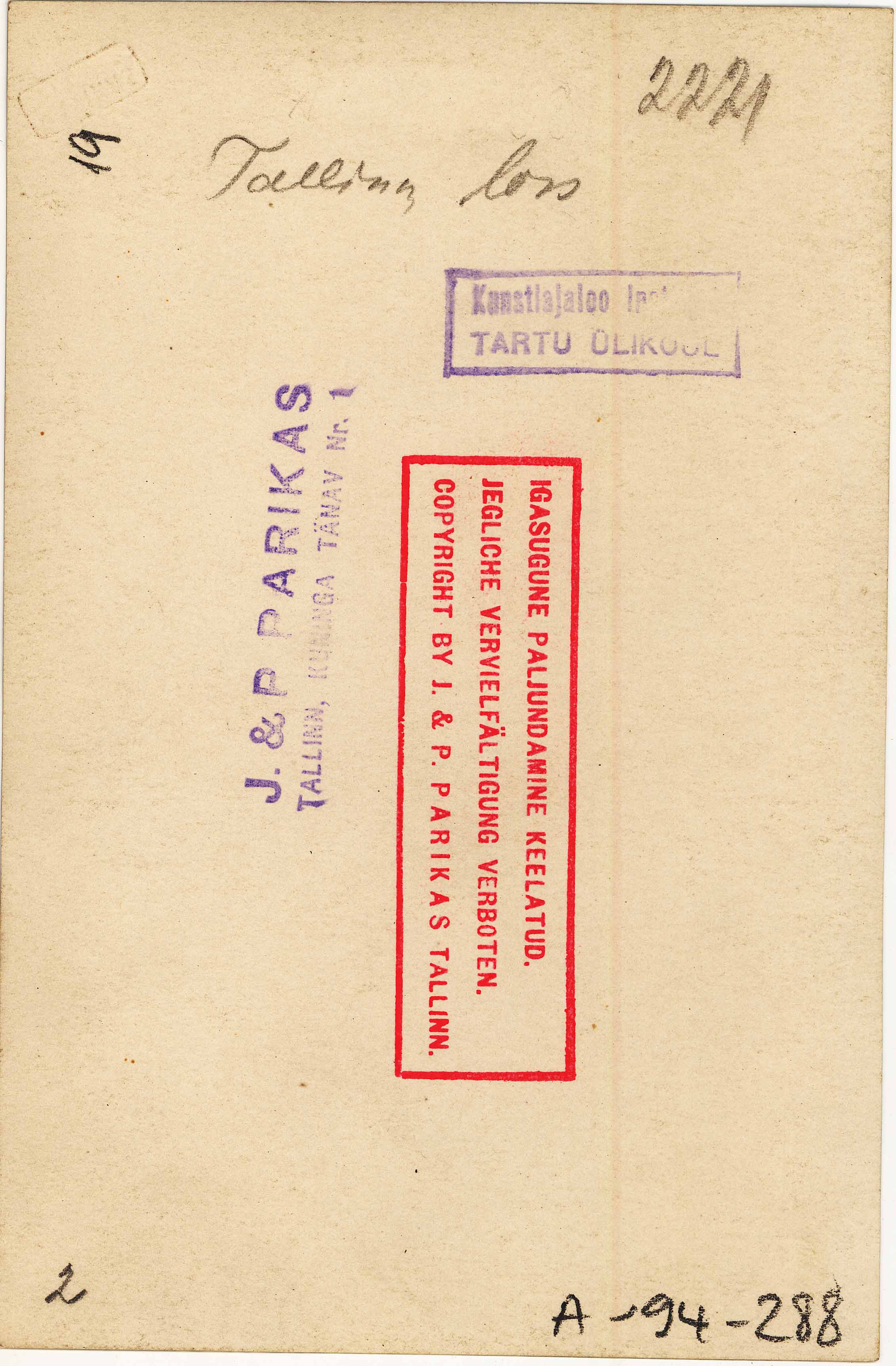 Tekst foto tagaküljel: Tallinn, loss. 2221. Templid: Parikas; Instituut