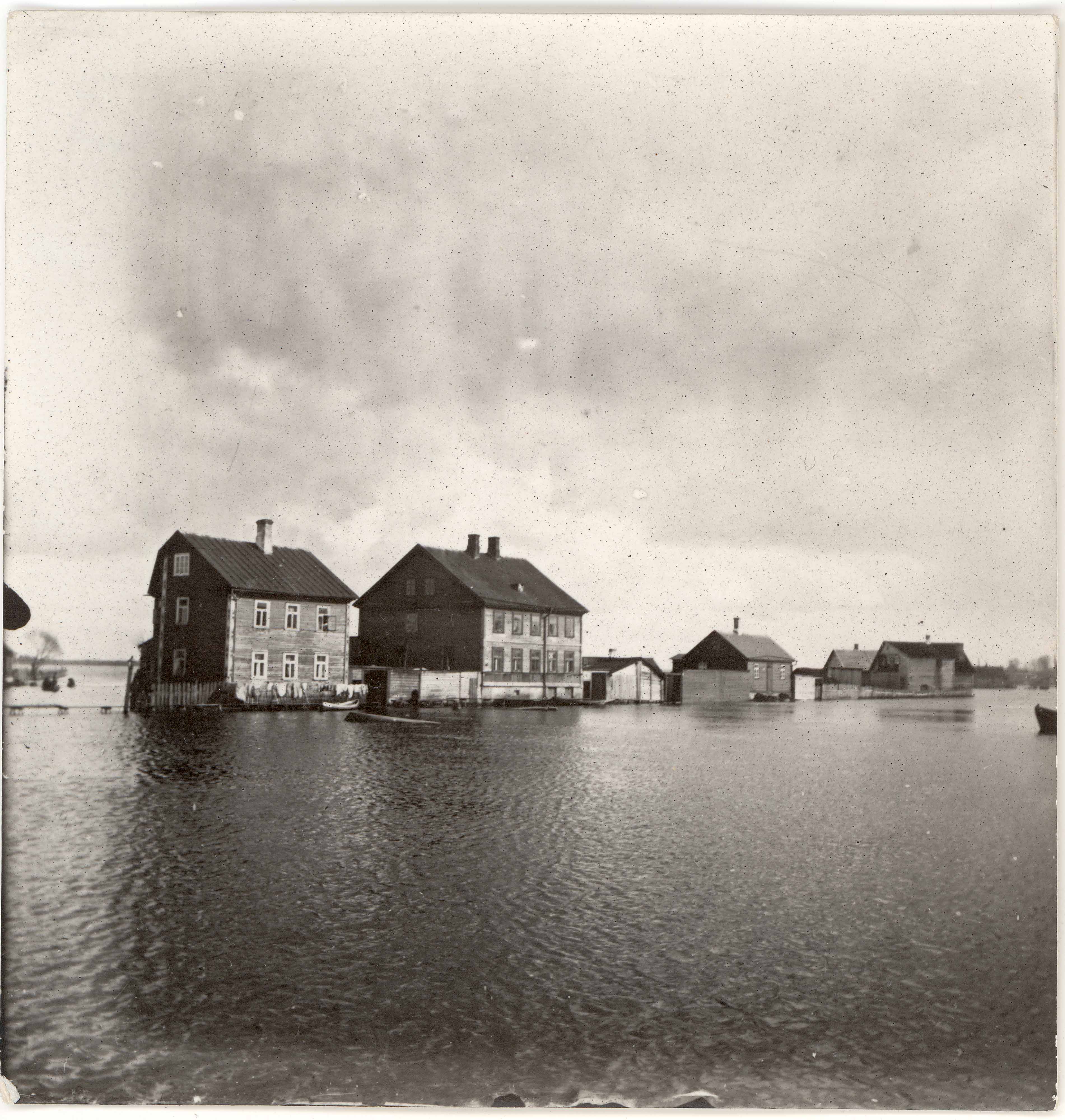 Tartu. Vaade Emajõelt suurvee ajal majadele Fortuuna ja Narva tn nurgal