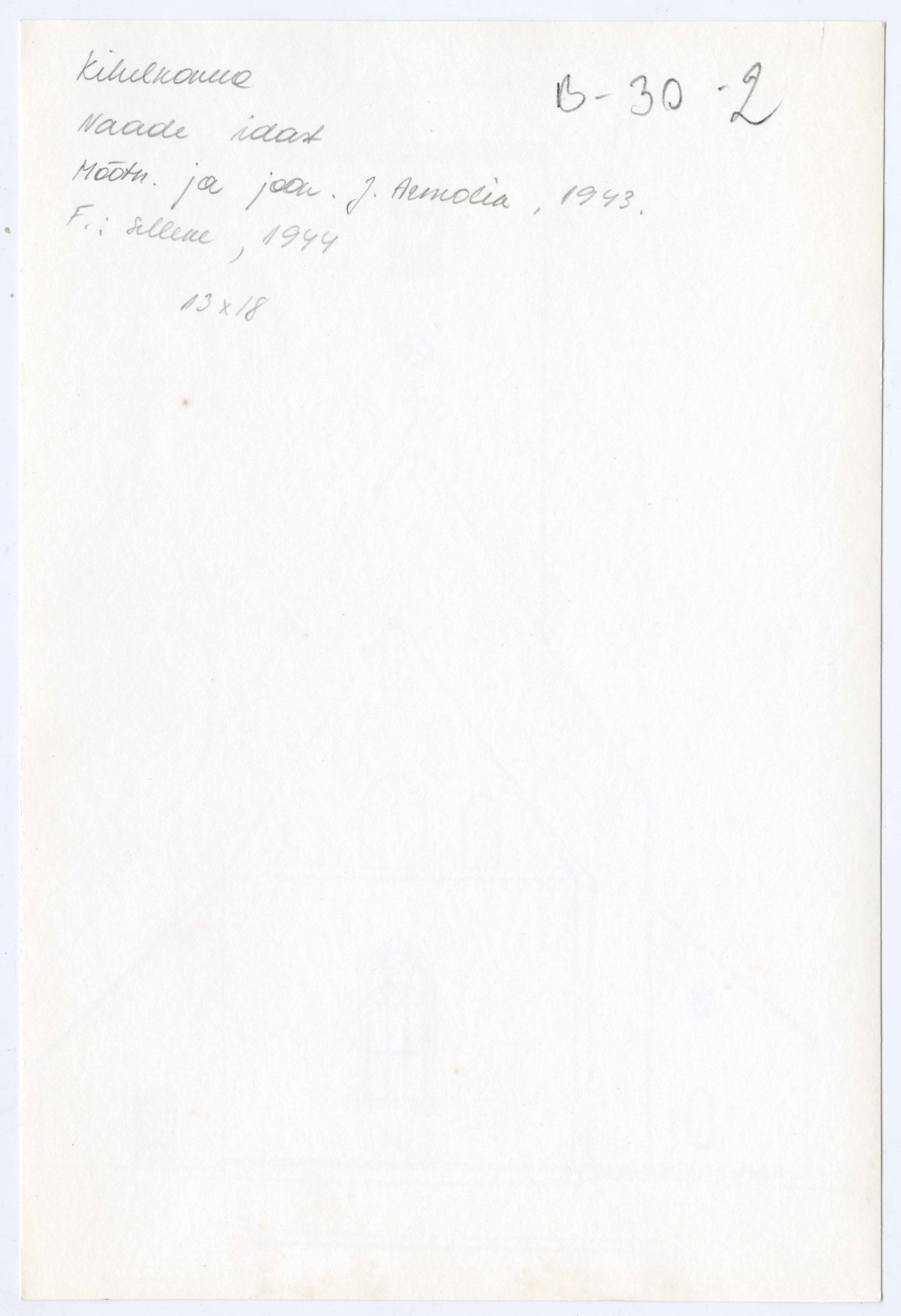 Tekst negatiivi ümbrikul: Kihelkonna. Vaade idast. Mõõtnud ja joonistanud J. Armolik 1943.a. Foto Selleke 1944.a. (1985) Tempel: Instituut