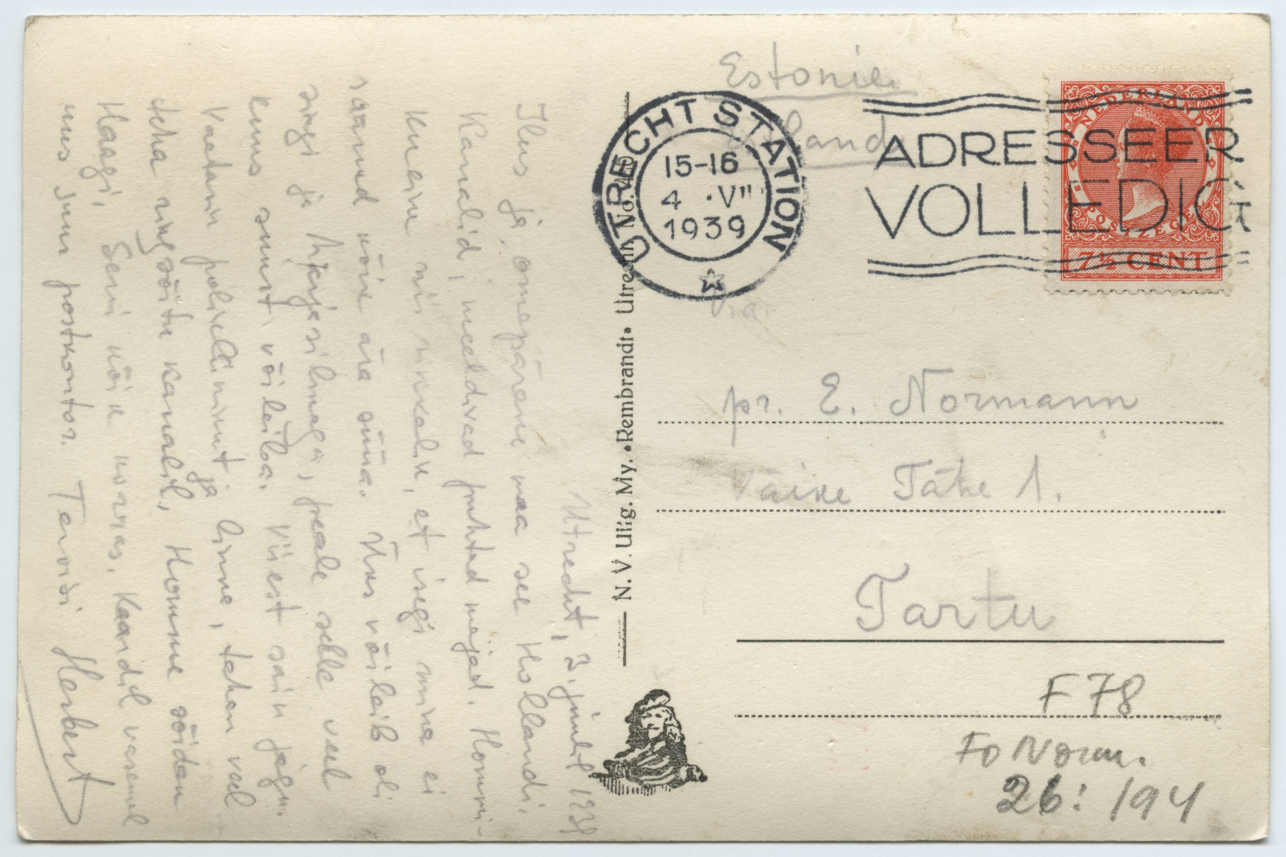 Pöördel Herbert Normanni kiri E[rna] Normannile. Utrecht, 3. juuli 1939