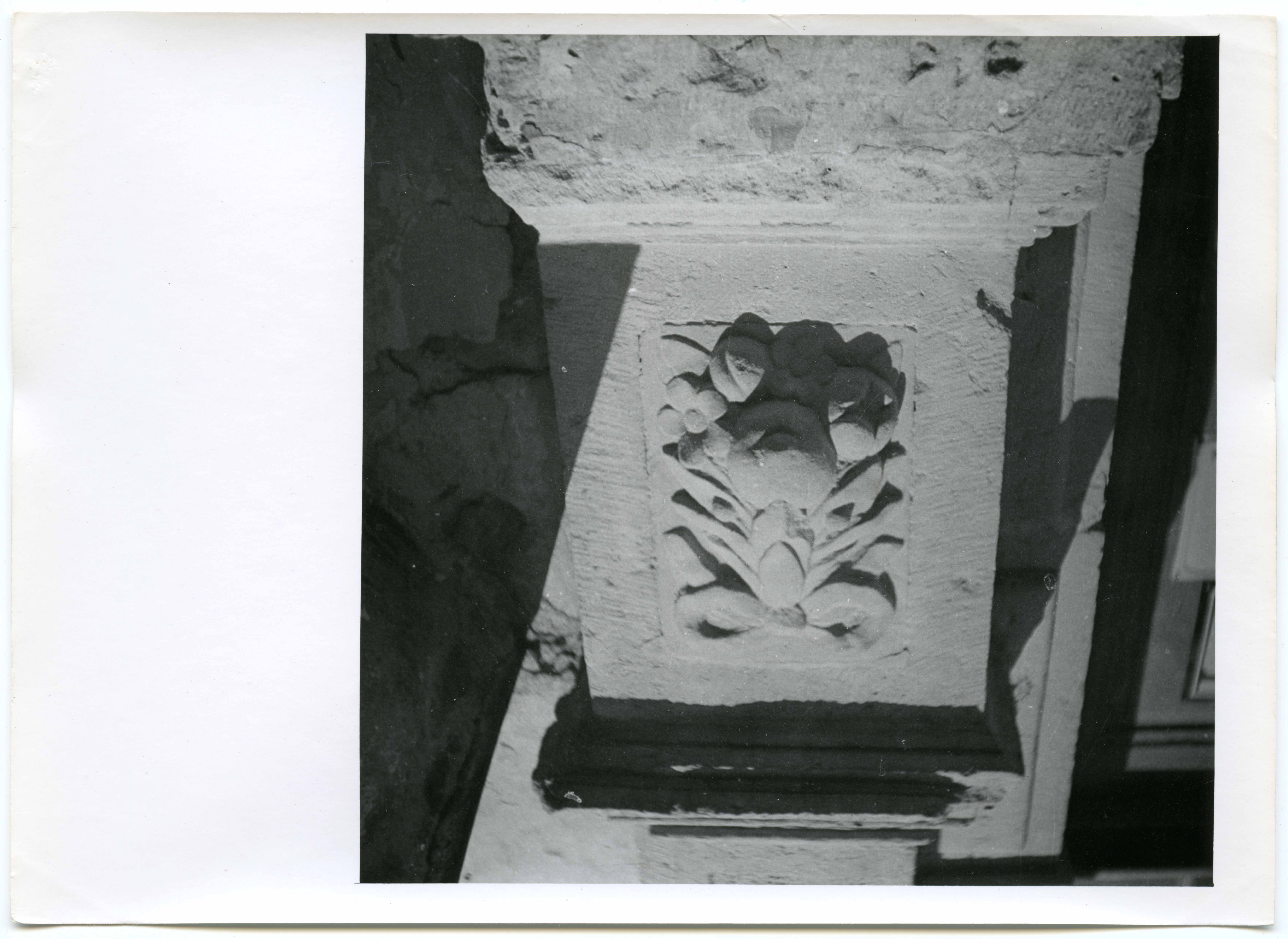 Narva. Rüütli tn 24, Hermann Poorteni maja portaali alaosa detail: puuviljakobar parempoolsel soklil. J. van der Capelle, 1695