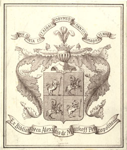 Nelinurkses raamistuses vapp, nelitatud vapikilbil lõvid ja ratsanikud. Joonises all keskel signeering: Cassetti 1886 all lindil: Ex Bibliotheca Alexidis de Markoff Petropolitani ülal lindil: MH ΠΑΝΤΑ ΕΠΑ ΣΤΑΣΘΑΙ ΠΡΟΘΥΜΕΟ ΜΗ ΠΑΝΤΩΝ ΑΜΑΘΗΣ TΕΝΗΙ