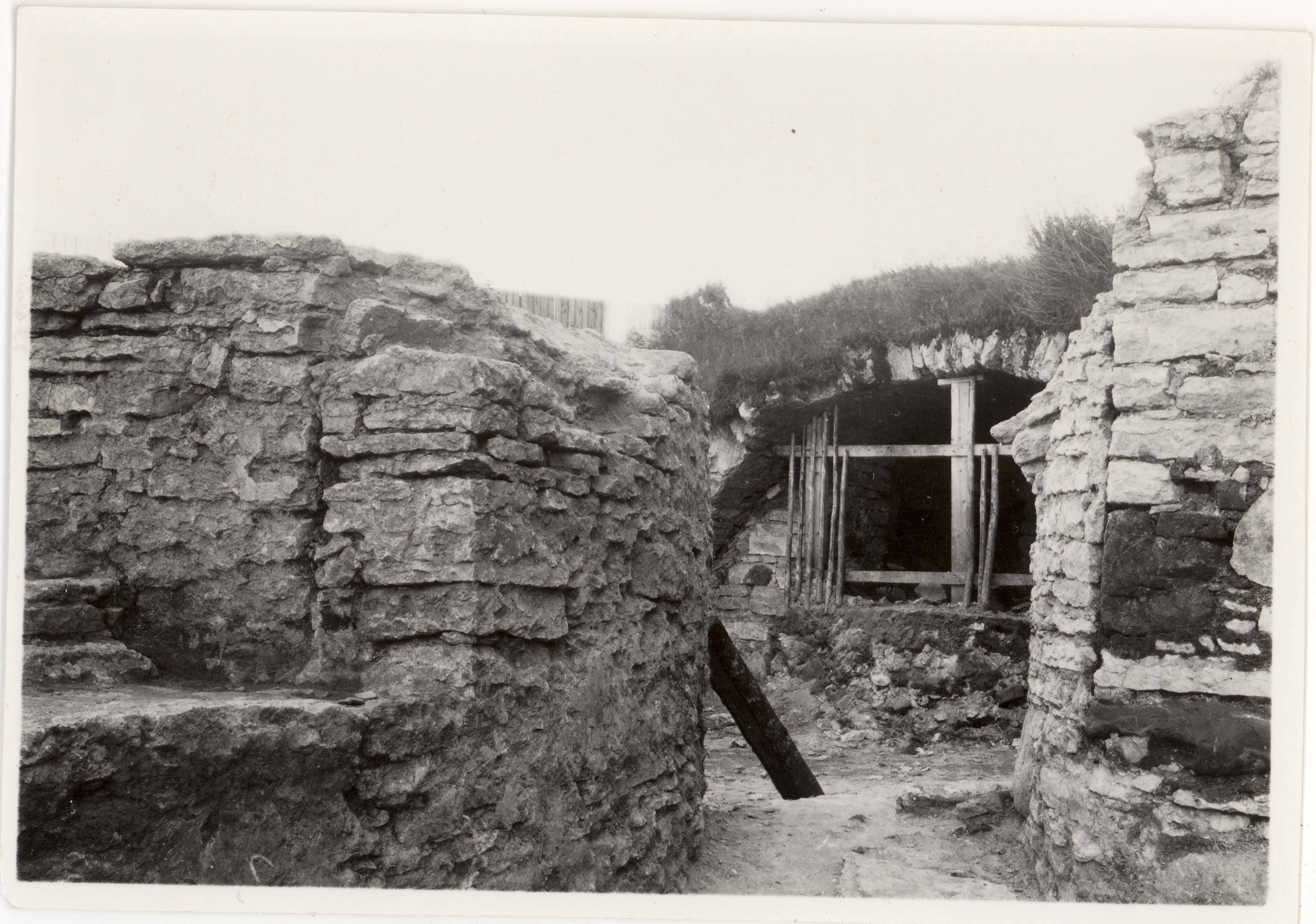Pirita kloostri idaosa arheoloogilised uurimistööd. Müür võlvitud keldri avause ees. Vaade edelasse