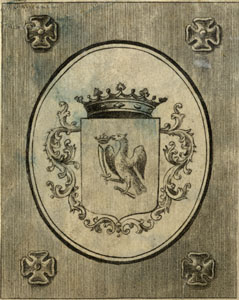 Nelinurksel viirutatud taustal vapp ovaalis, vapikilbil kotkas mõõga ja krooniga, joonise nurkades rosetid