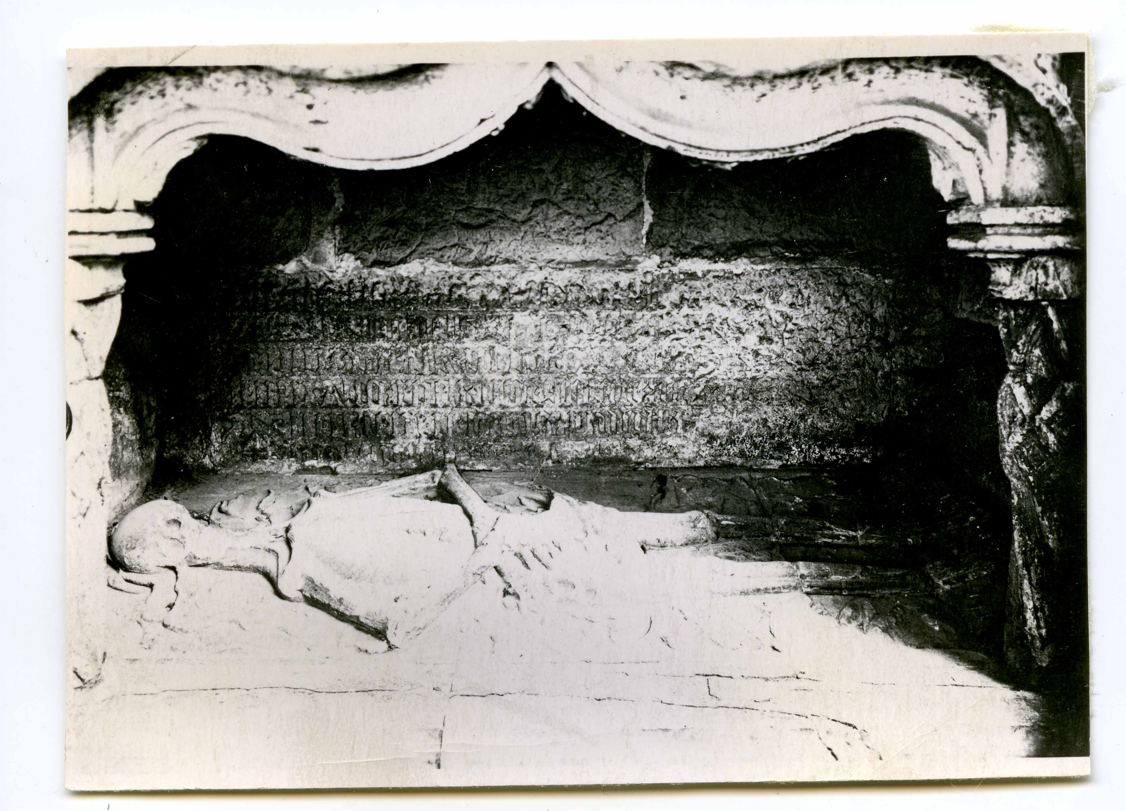Tallinn. All-linn. Oleviste kirik. Hans Pawelsi kenotaaf Maarja kabeli välisseinal. Alumine nišš luukere kujutise ja Pawelsi mälestustahviga. Hinrik Byldensnyder. 1513-1516.a.