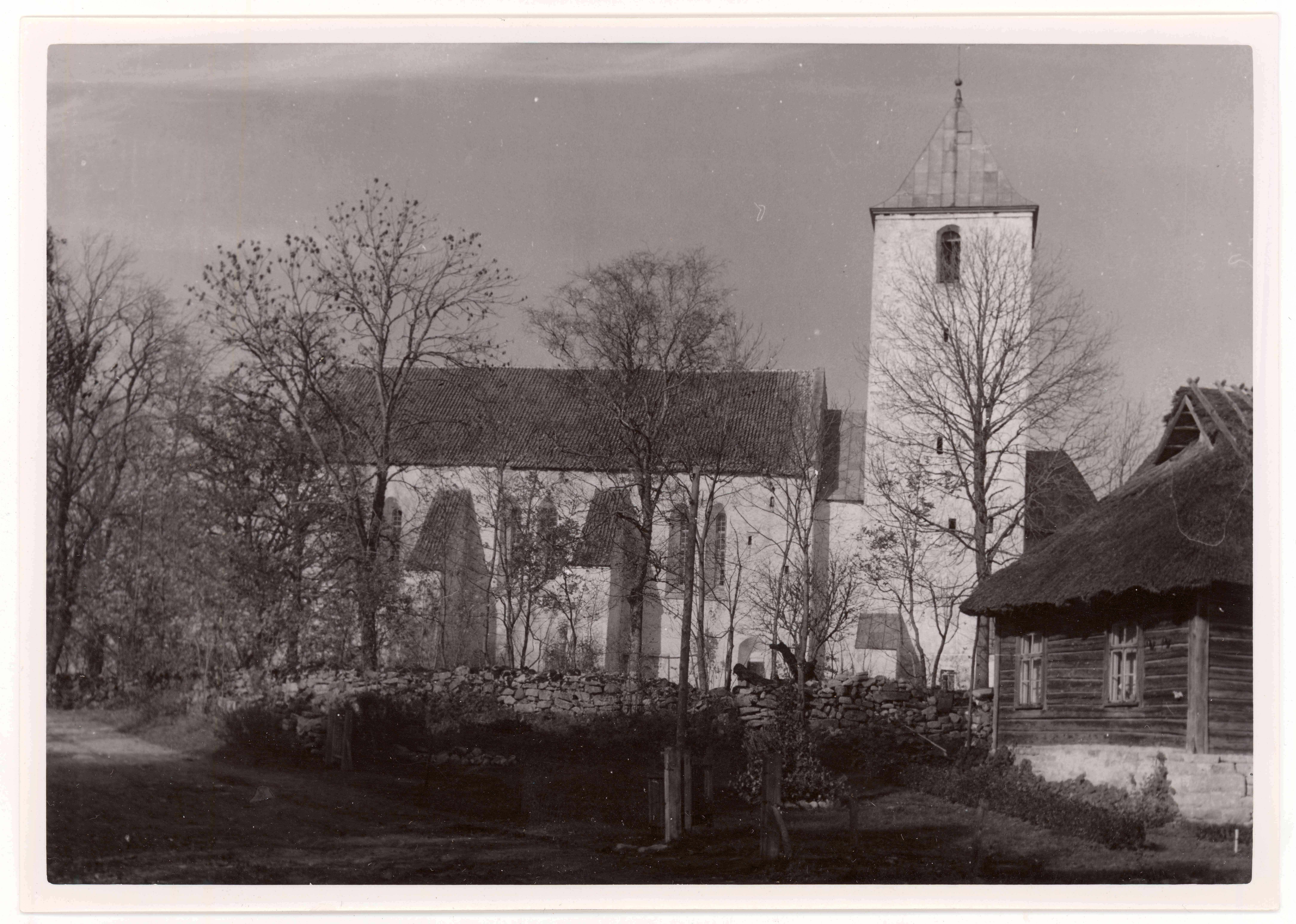 Valjala Martini kiriku välisvaade S-st. Vasakul pastoraat
