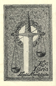 Nelinurkses raamistuses pärg, alla suunatud teravikuga mõõk ja kaalud. Joonises all paremal: Ex / Libris / Auli Markkula