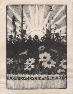 Nelinurkses raamistuses lillepuhma tagant tõusev päike. Joonises all: EX*LIBRIS*INGRID af SCHULTÉN