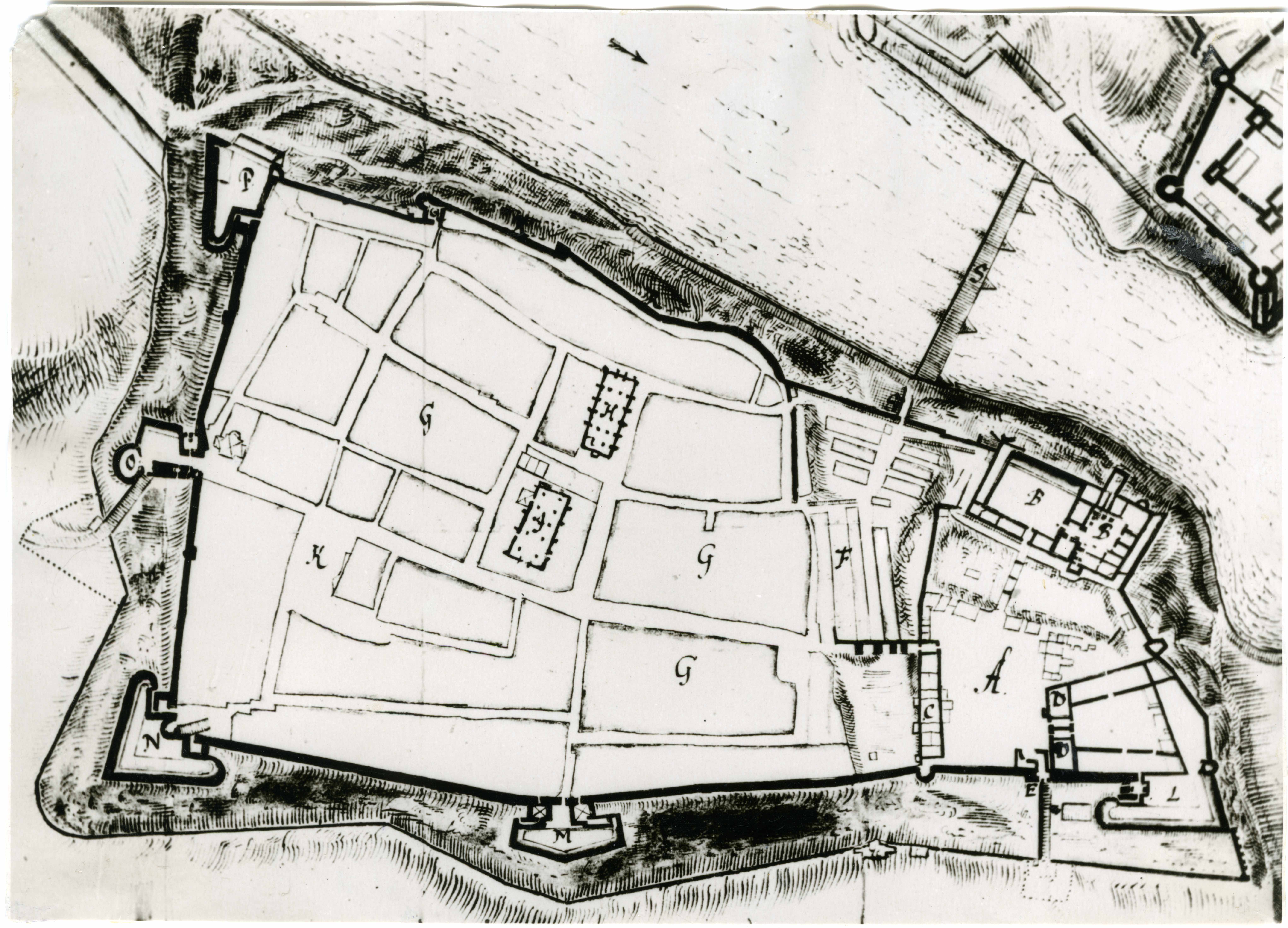 Osa Narva eeslinna ja Ivangorodi kindlustamise plaanist (1650): Narva linnuse ja linna kindlustuste plaan. Heinrich von Seulenberg. Orig. Rootsi Sõjaarhiivis