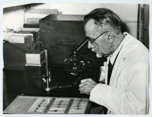 Albert Valdes laua ääres mikroskoobiga töötamas