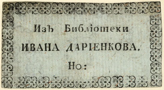 Mustas nelinurkses ornamenteeritud raamistuses: Изъ Библiотеки / ИВАНА ДАРIЕНКОГА. / Но: