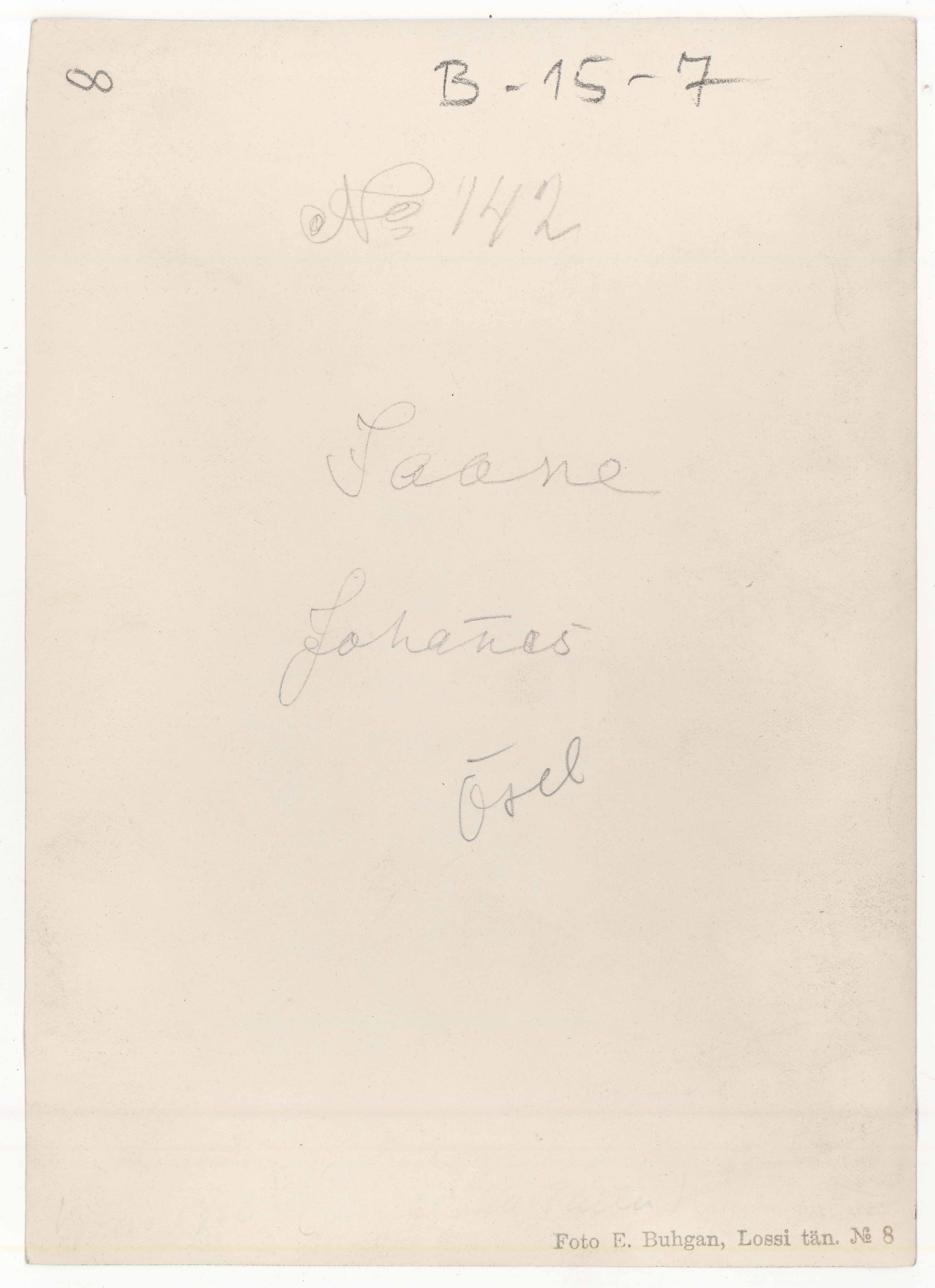 | dc.description | Tekst foto tagaküljel: No 142. Saare. Johanes. Ösel. Trükitud: Foto E. Buhgan. Lossi tän No 8. | et |