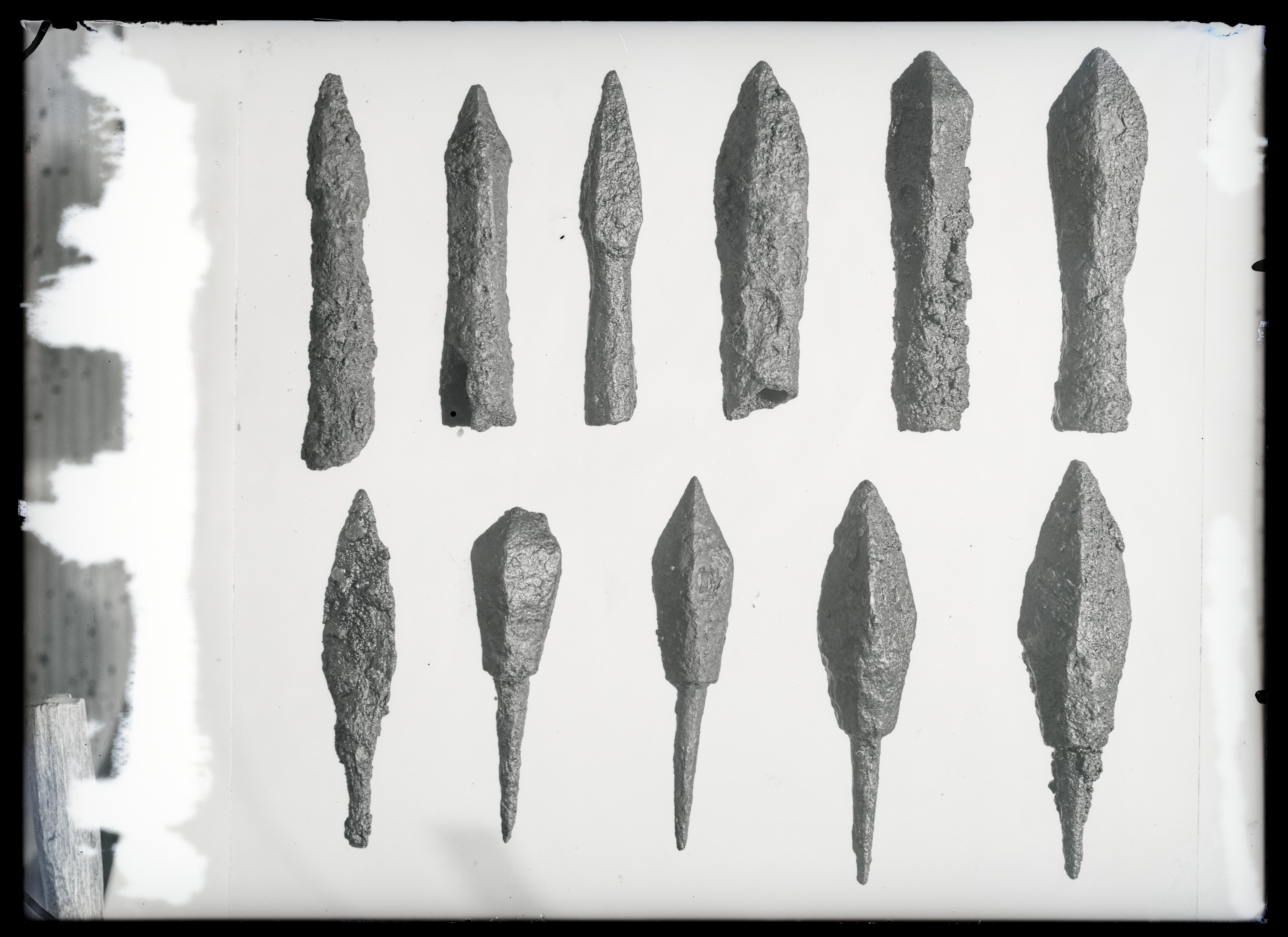 Tekst negatiivi ümbrikul: Viljandi. 1939 a. Kaevamisel leitud nooleotsad. Foto Selleke (1941). Tempel: Kabinett