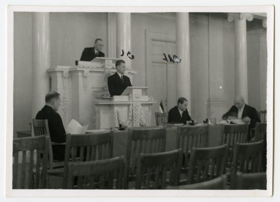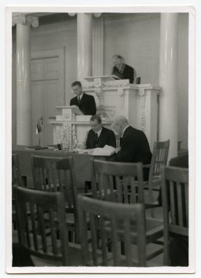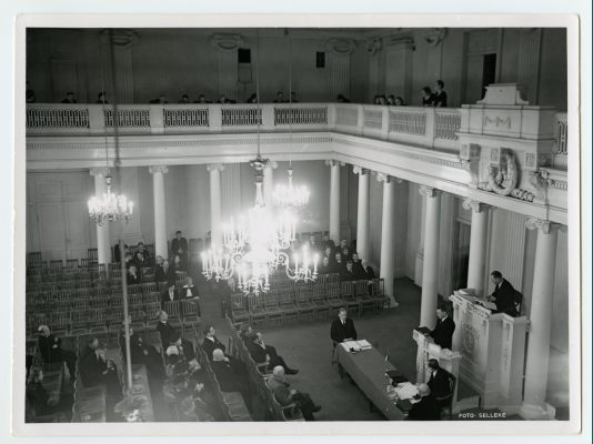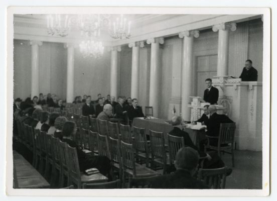Gustav Ränk kaitsmas doktoritööd Tartu ülikooli aulas 1938. a.