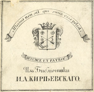 Nelinurkses raamistuses vapp, vapikilbil tuulelippu hoidev käsi ja kaks risti. Joonises all: Изъ Библiотеки / И.А. КИРIЬЕВСКАГО. ülal lindil deviis: Alterius non sit qui suus esse potest. keskel lindil: SCIECE ET PATRIAE.