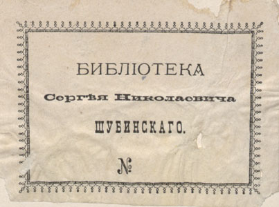 | dc.description | Nelinurkses ornamenteeritud raamistuses keskel tekst: БИБЛIОТЕКА / Сергѣя Николаевича / ШУБИНСКАГО. / № | |