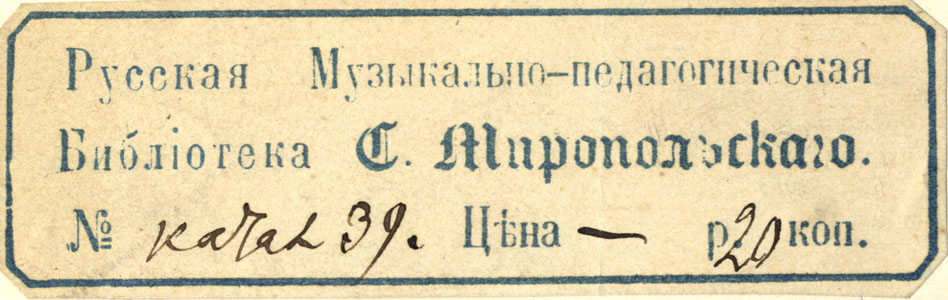 | dc.description | Kaheksanurkses raamistuses tekst: Русская Музыкально-педагогическая / Библiотека С. Миропольскаго. / № Цѣна р. коп. | |
