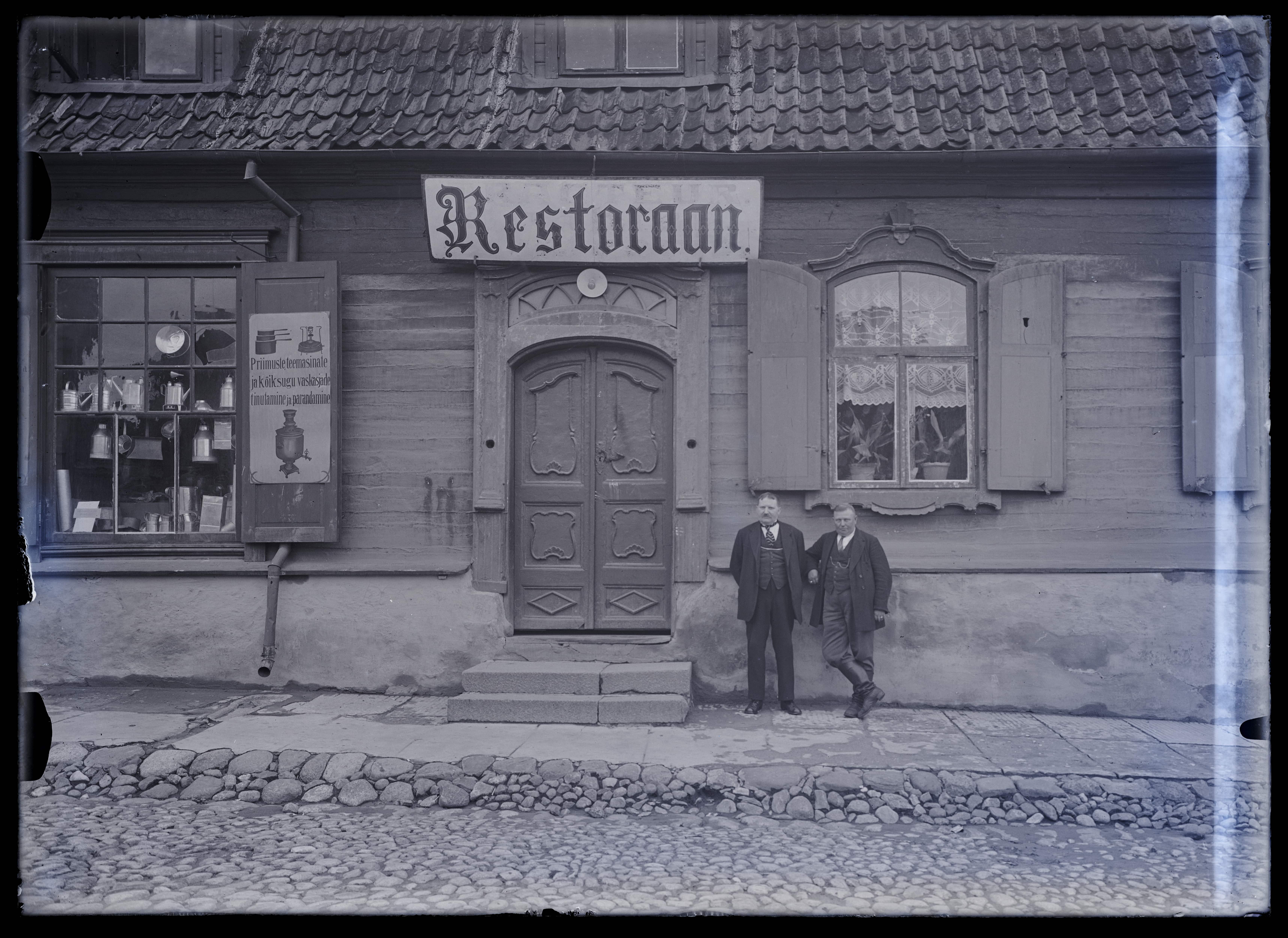 Valga. Kuperjanovi tn 1 (hävinud) portaal ja aknad. Hoones asus restoran. Pildil äride omanikud? (2 meest)